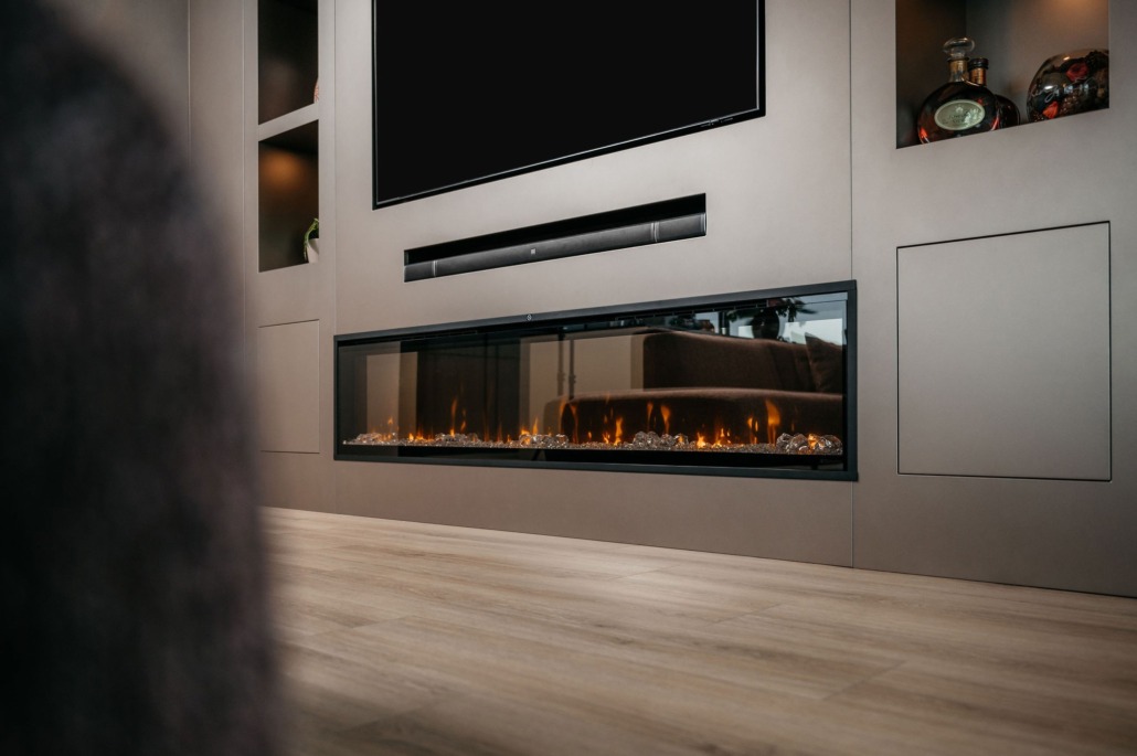 In Almere plaatsten we een taupe cinewall met sfeerhaard. Wat een perfect plaatje!