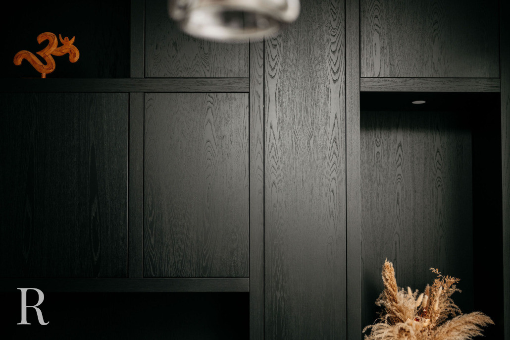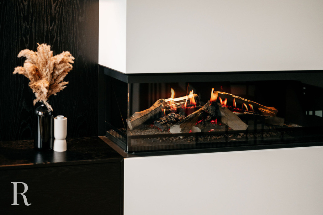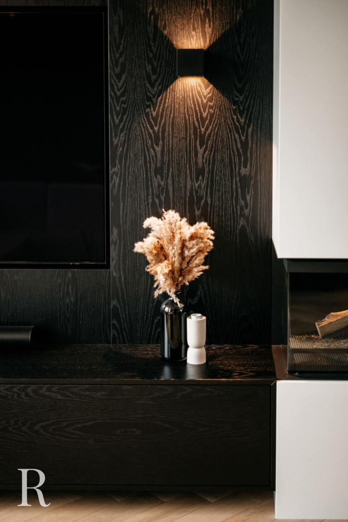 De zwarte cinewall vormt het hart van het interieur. Elegant ingebed in donker houtfineer, met een zwevend meubel dat rust uitstraalt. De haard voegt sfeer toe – zelfs als hij niet brandt.