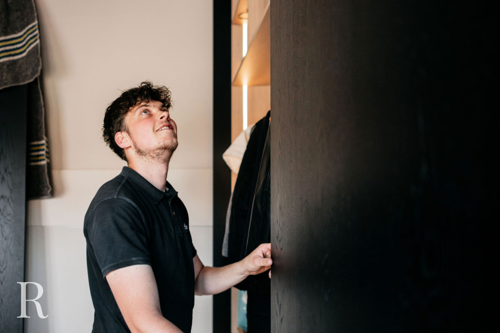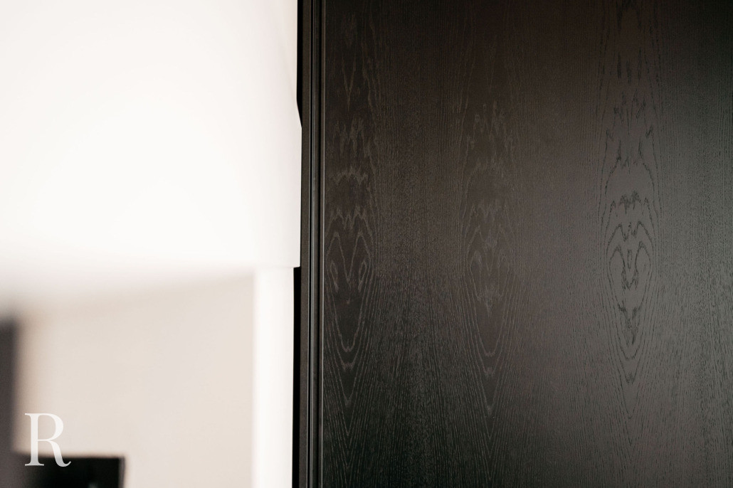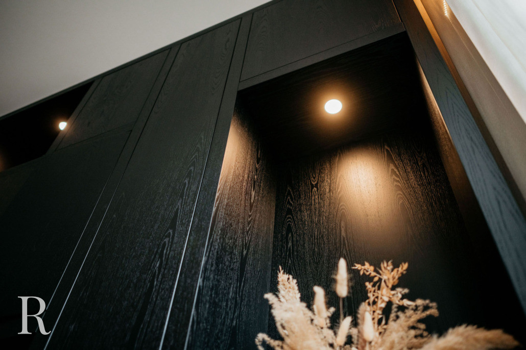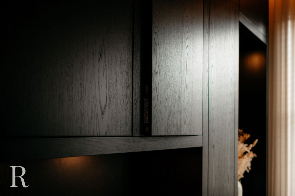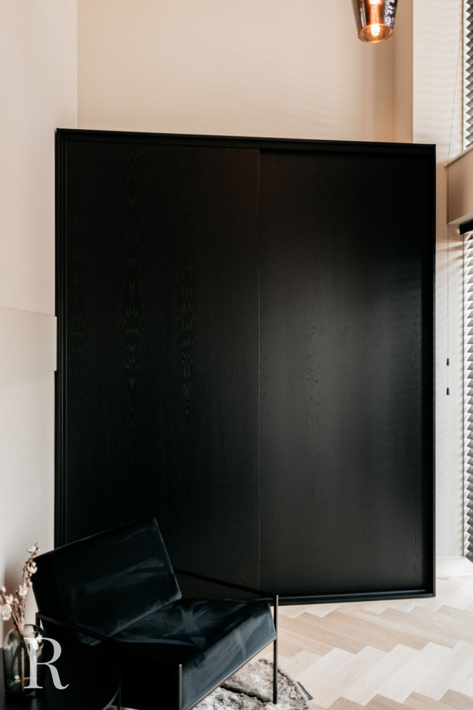 We ontwierpen ook twee maatwerkkasten. Eén wandkast, een podium voor bijzondere objecten en boeken. De ander – een garderobekast bij de entree – oogt minimalistisch, maar is groots in functionaliteit. Beide vervaardigd uit hetzelfde materiaal als de cinewall.