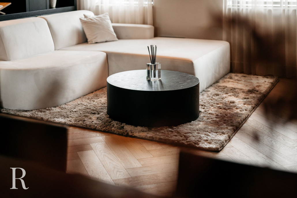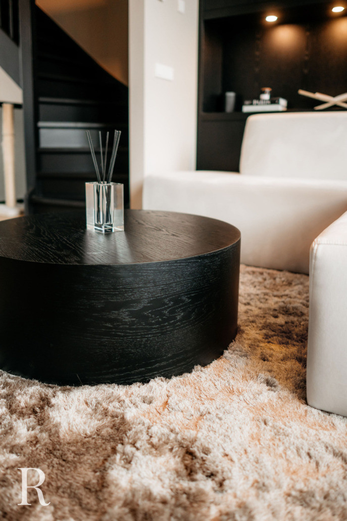 De salontafel maakt de compositie compleet. Rond, krachtig en ingetogen. Elk element draagt bij aan een gevoel van rust en rijkdom.