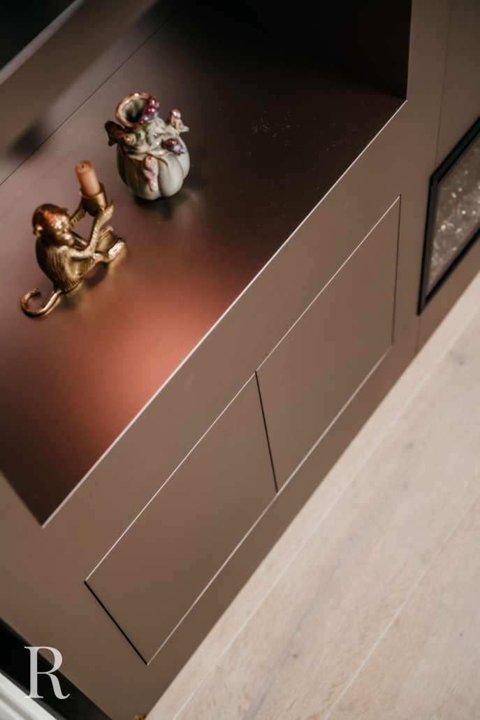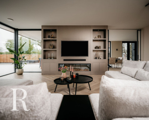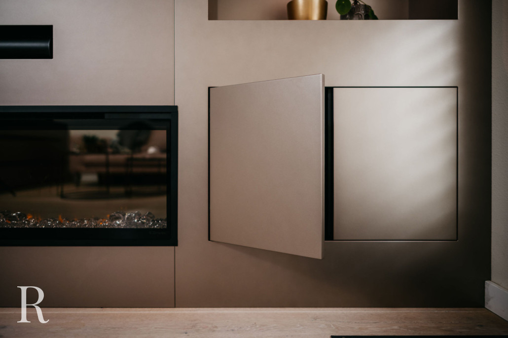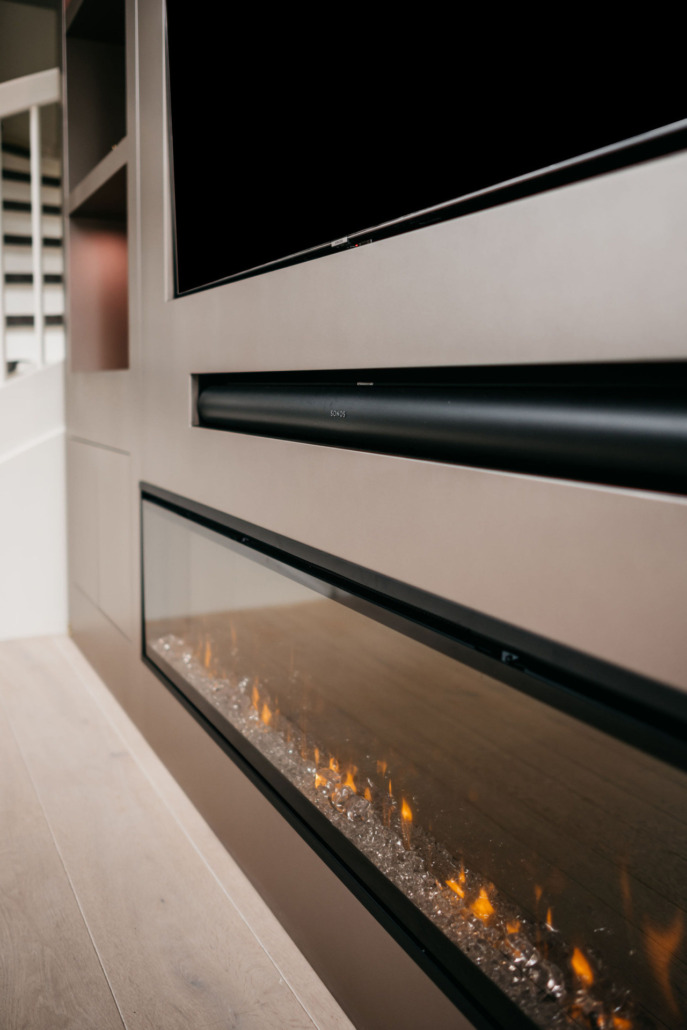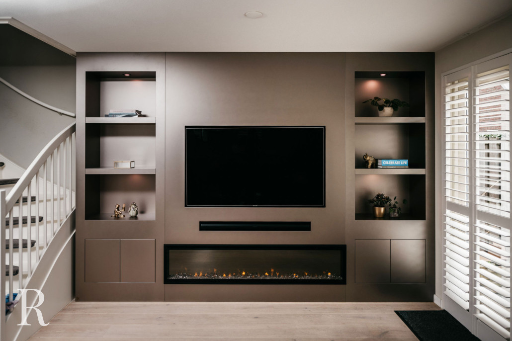 In Assendelft plaatsen we een taupe cinewall met sfeerhaard, dressoir én renoveerden we de hal. Wat een transformatie!