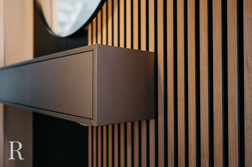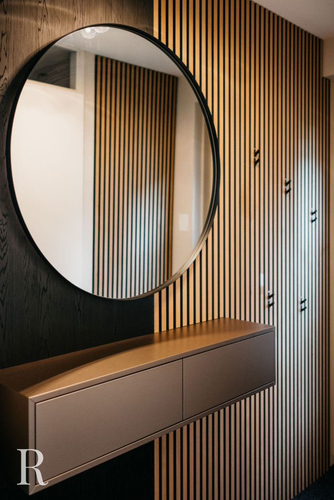 In deze woning is het de taupe cinewall. Dat kan niet missen. Met deze wand maakt u echt een statement. Niet alleen dankzij het strakke ontwerp, maar ook de taupe kleur is een eyecatcher. Ziet u hoe de lichtinval het verschil maakt? Het bepaalt welke elementen in deze cinewall opgelicht worden. Taupe matcht ook perfect met de witte lamellen, traptreden en lichte vloer.
