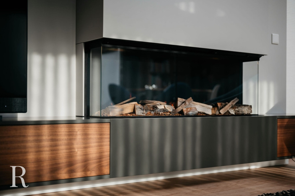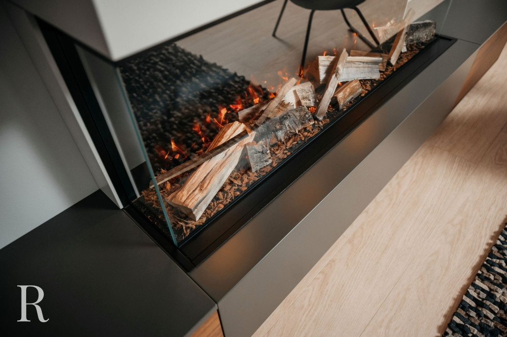 Het middelpunt van deze cinewall is de sfeerhaard. We bouwden het in een verticale wandkolom. Deze staat haaks op het tv-meubel en voegt daardoor een extra dimensie toe aan de cinewall. De sfeerhaard roept niet alleen een gevoel van gezelligheid op, maar is ook een praktische warmtebron. De realistische houtblokken en vlammen creëren een authentieke haardervaring. Voor een ontspannen moment!