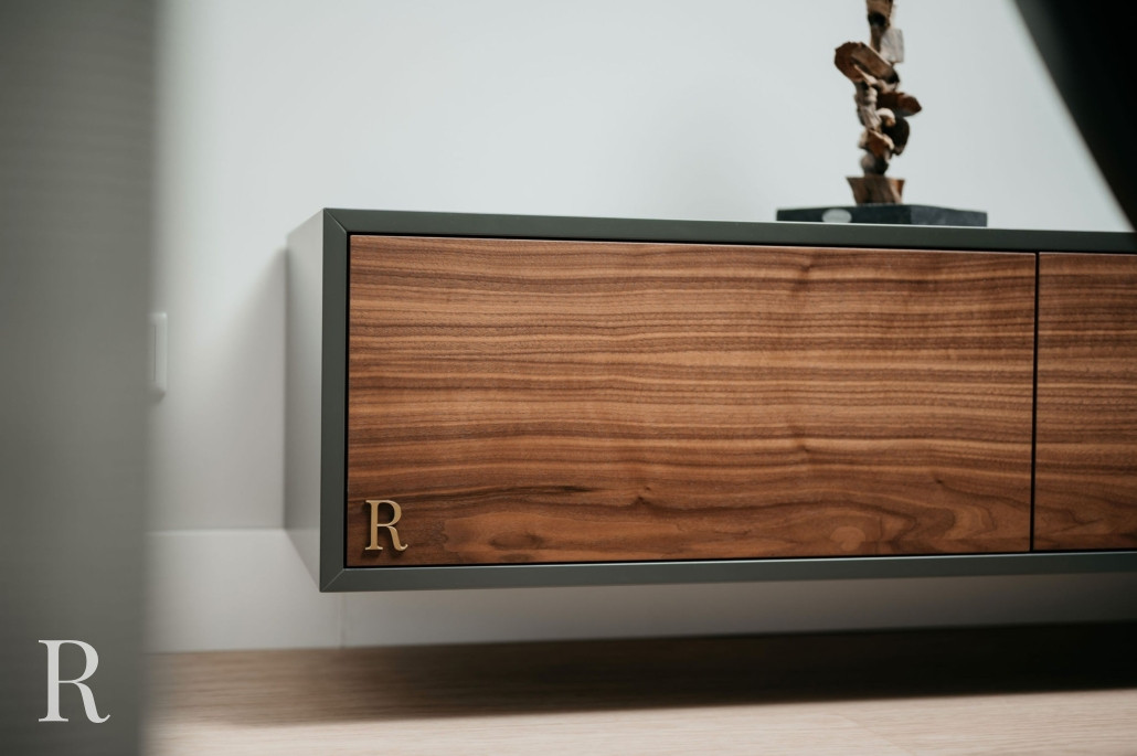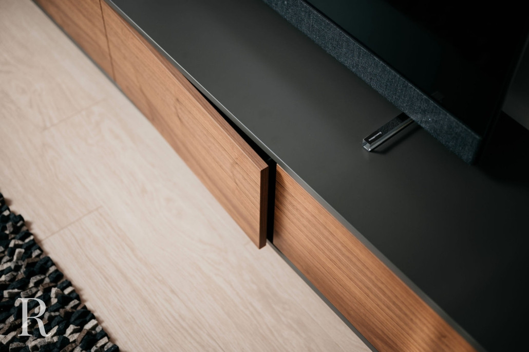Het zwevende tv-meubel is uitgevoerd in antraciet. De diepe, donkergrijze kleur is een luxueus alternatief voor zwart. Het is tijdloos, veelzijdig en professioneel. Om het meer warmte te geven, kozen deze bewoners voor walnoothouten kasten. Het komt terug in de wandplank, die doorloopt in de wand. Dat geeft een speelse draai aan het strakke ontwerp.