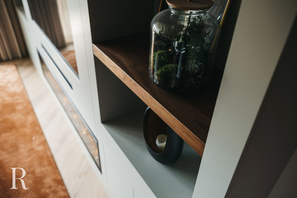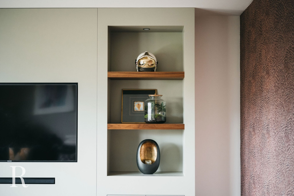 De lichte, neutrale tinten van de cinewall zijn een mooie tegenhanger van de met slangenprint beklede wand, het warme vloerkleed en de fluweel groene bank. Let u ook op de persoonlijke woonaccessoires in het maatwerk meubel? Dankzij de nissen heeft u ruimte om van uw huis een thuis te maken. Om uw cinewall een persoonlijk karakter te geven met bijvoorbeeld helmen, fotolijstjes en souvenirs.