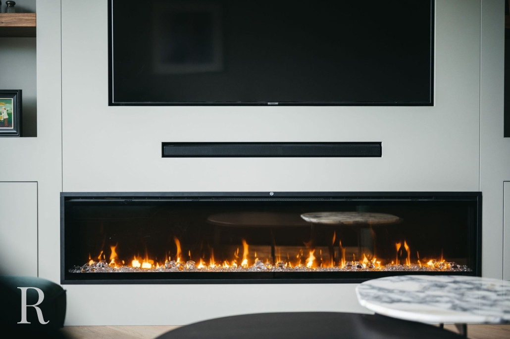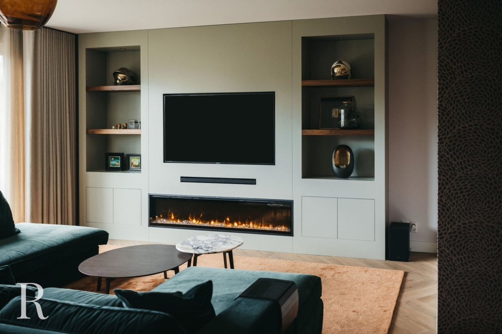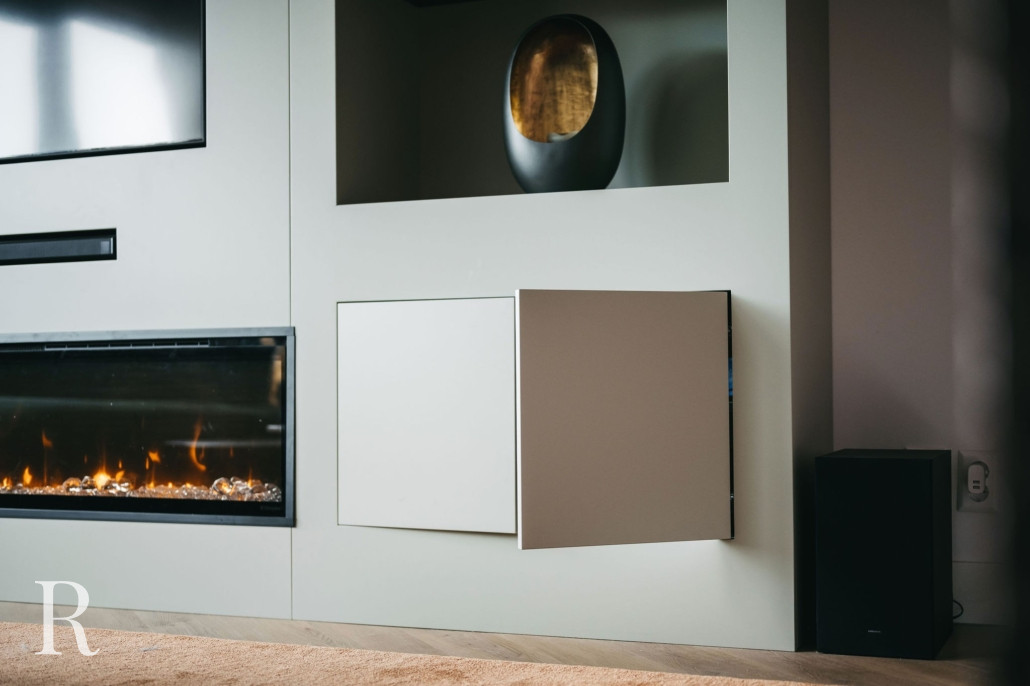 Een cinewall hoeft niet altijd uw volledige muur te bekleden. Daar is dit maatwerk meubel een mooi voorbeeld van. Voor deze klant in Blaricum maakten we een cinewall op maat met uitsparingen voor een flatscreen, soundbar en een sfeerhaard.