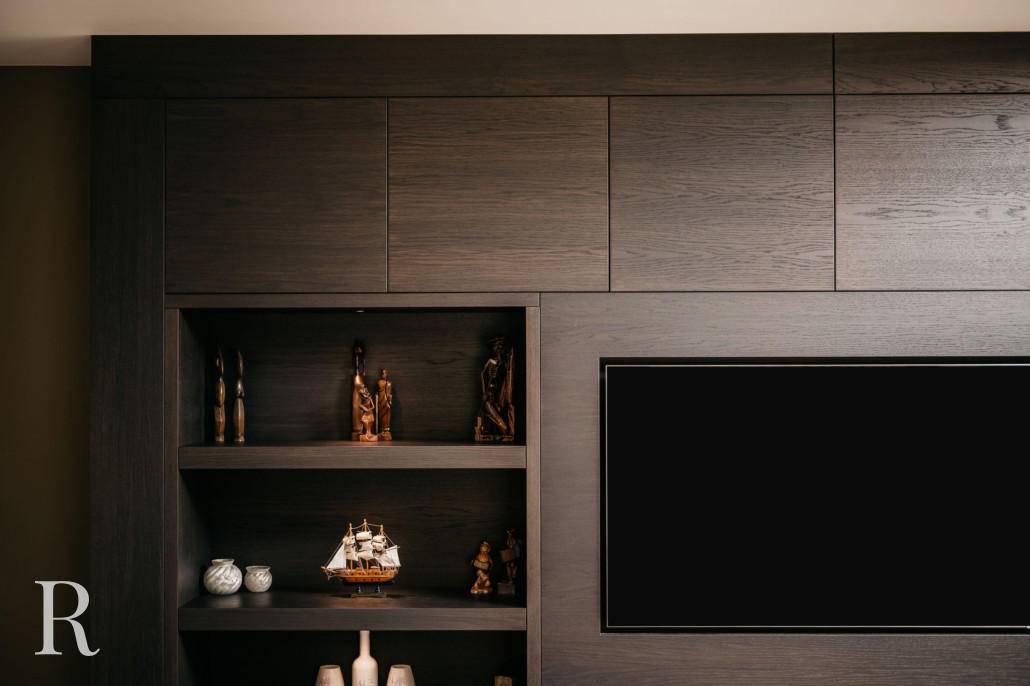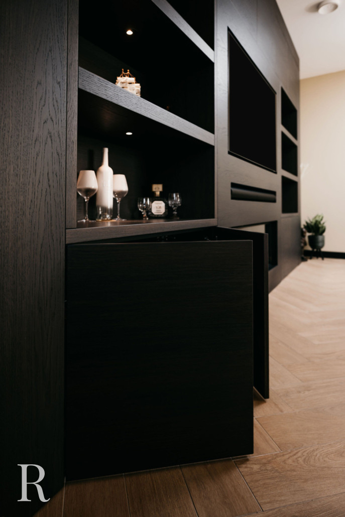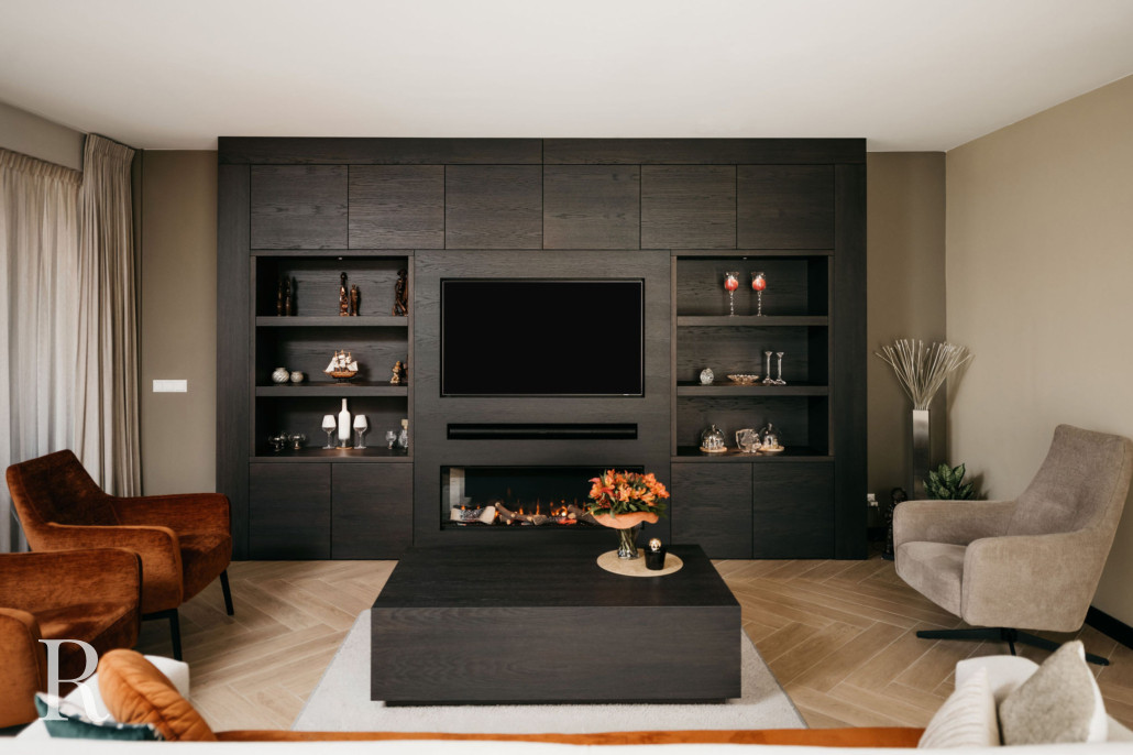 Meer warmte toevoegen aan uw interieur? Een donkerbruine cinewall heeft een rijke uitstraling die de sfeer in de ruimte bepaalt. Prachtig in combinatie met de bronzen accenten in deze woonkamer. Dat niet alleen: het donkere hout geeft ook een luxe gevoel af. Dankzij de karakteristieke aderen is elk meubelstuk uniek. De strakke lijnen van de ombouw zorgen voor een moderne look.
