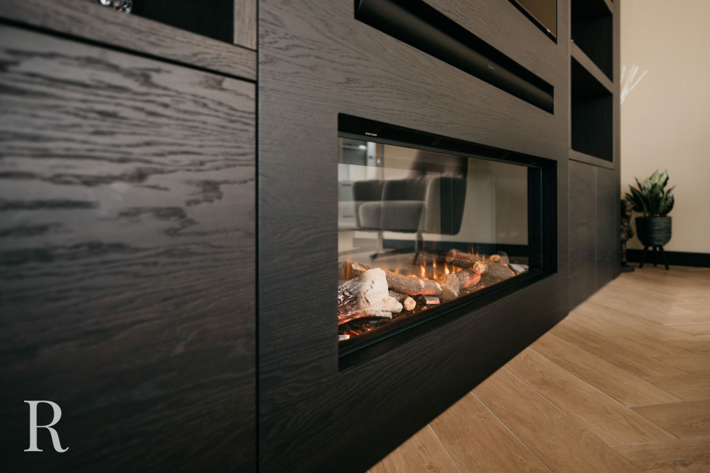 In Blokker plaatsen we een donkerbruine cinewall met sfeerhaard én bijpassende salontafel. Echt één geheel!