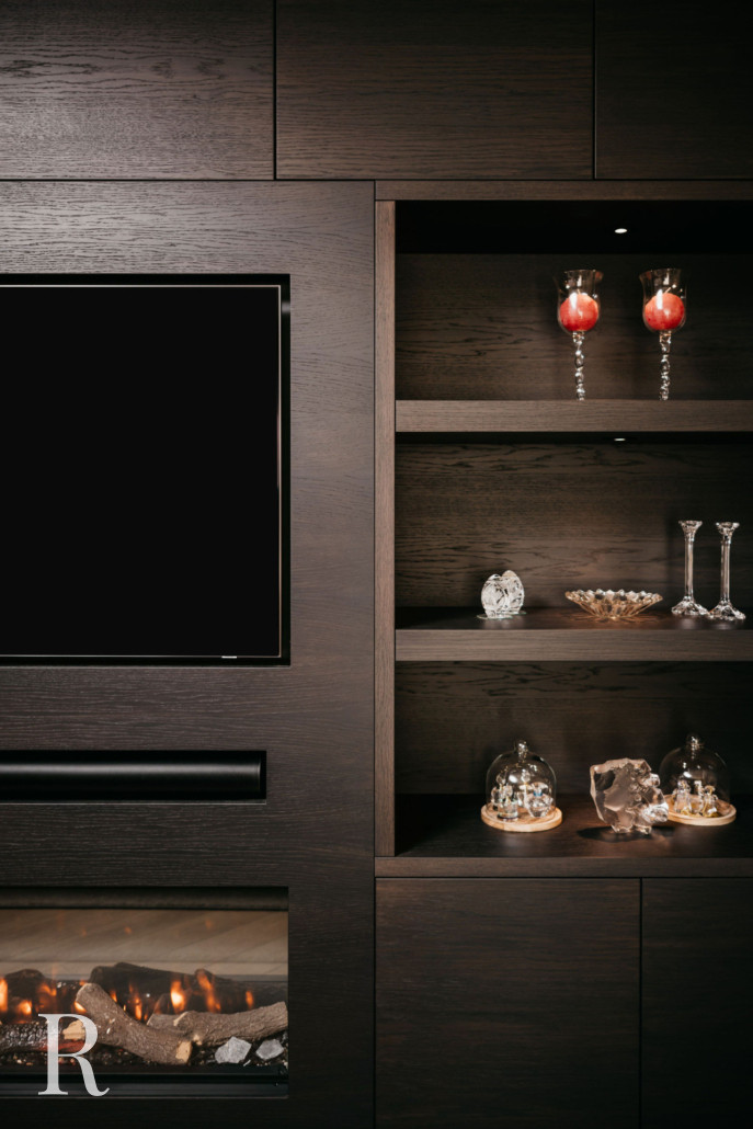 Centraal in de cinewall staat de flatscreen tv. Maar het biedt meer dan dat. De ingebouwde sfeerhaard is, naast een functionele warmtebron, ook een sfeermaker. Het verhoogt de gezelligheid direct. De haard wordt omgeven door open schappen met sfeerverlichting. Elk decoratief item in de vakken is zorgvuldig gekozen.