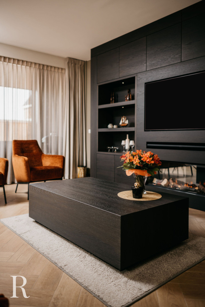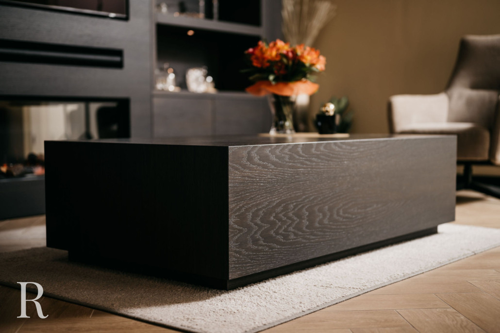 Om de eenheid in de ruimte te bewaren, hebben we het niet bij een cinewall gelaten. Deze bewoners lieten een bijpassende salontafel ontwerpen. Deze tafel in blokvorm is massief, maar elegant. Opvallend, en verfijnd. Het past perfect bij elkaar!