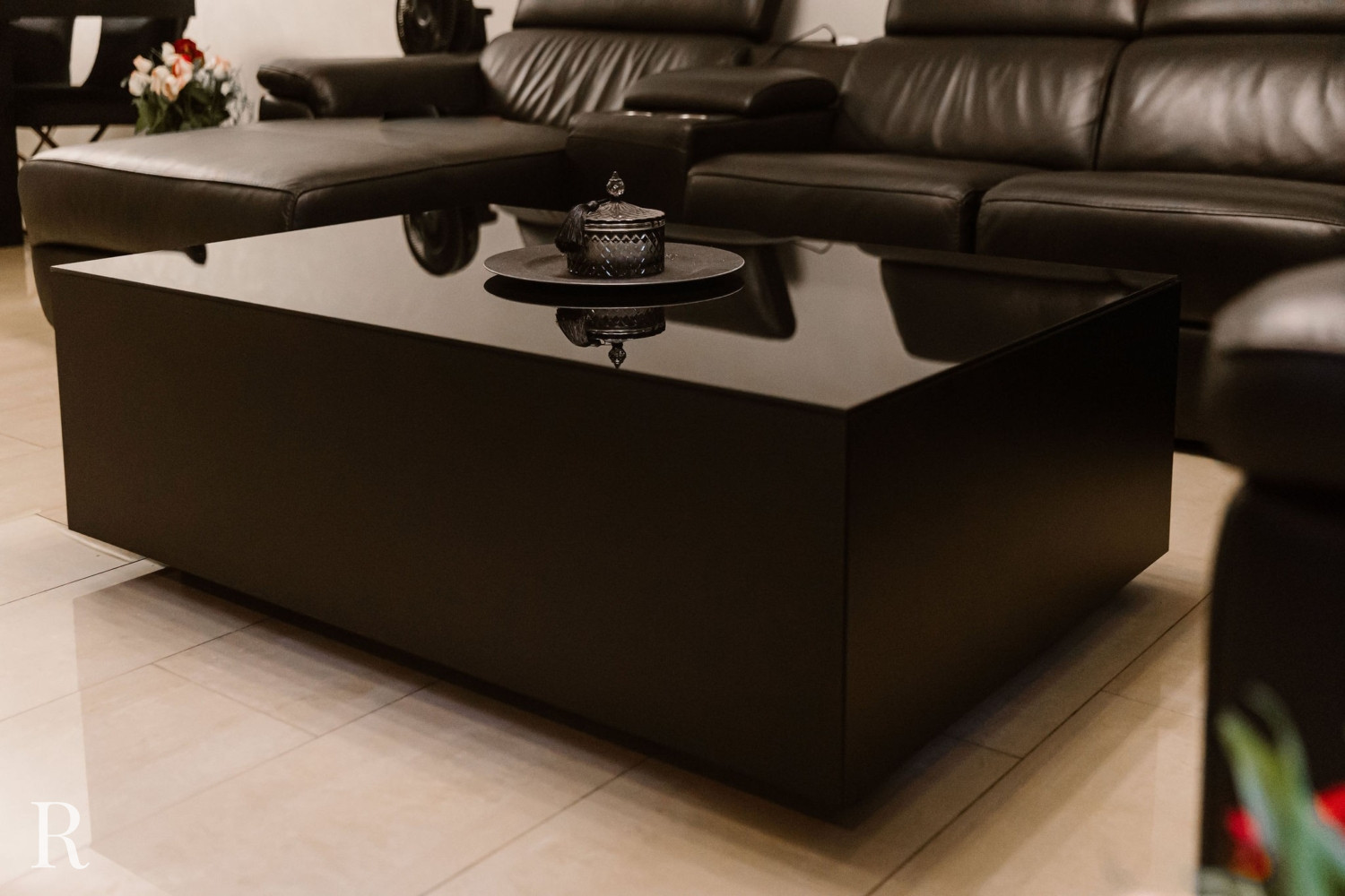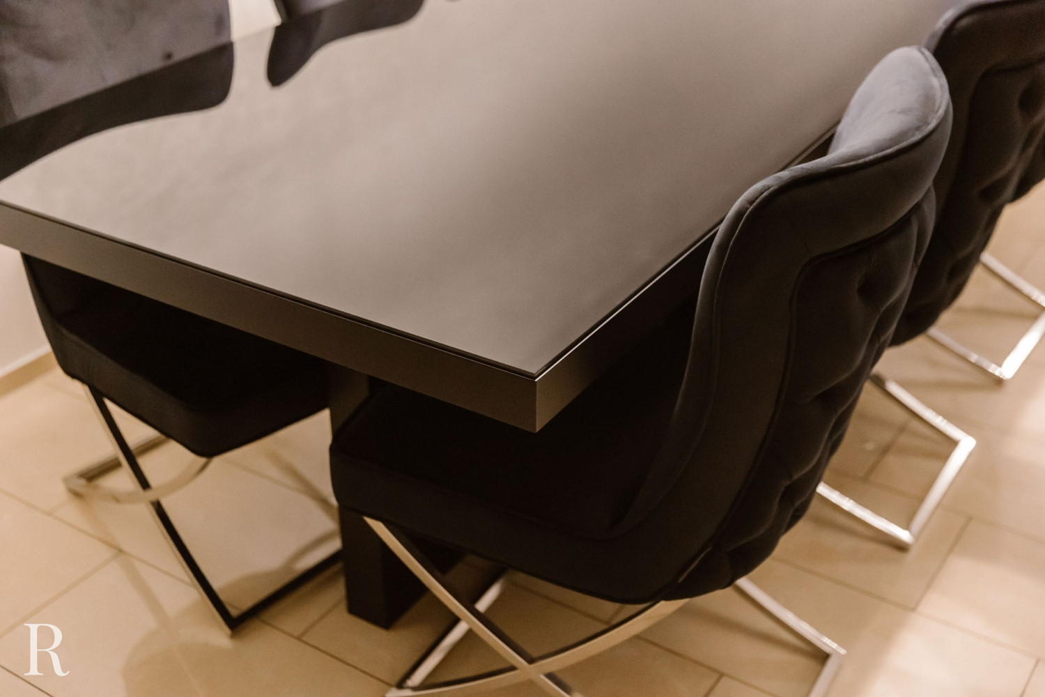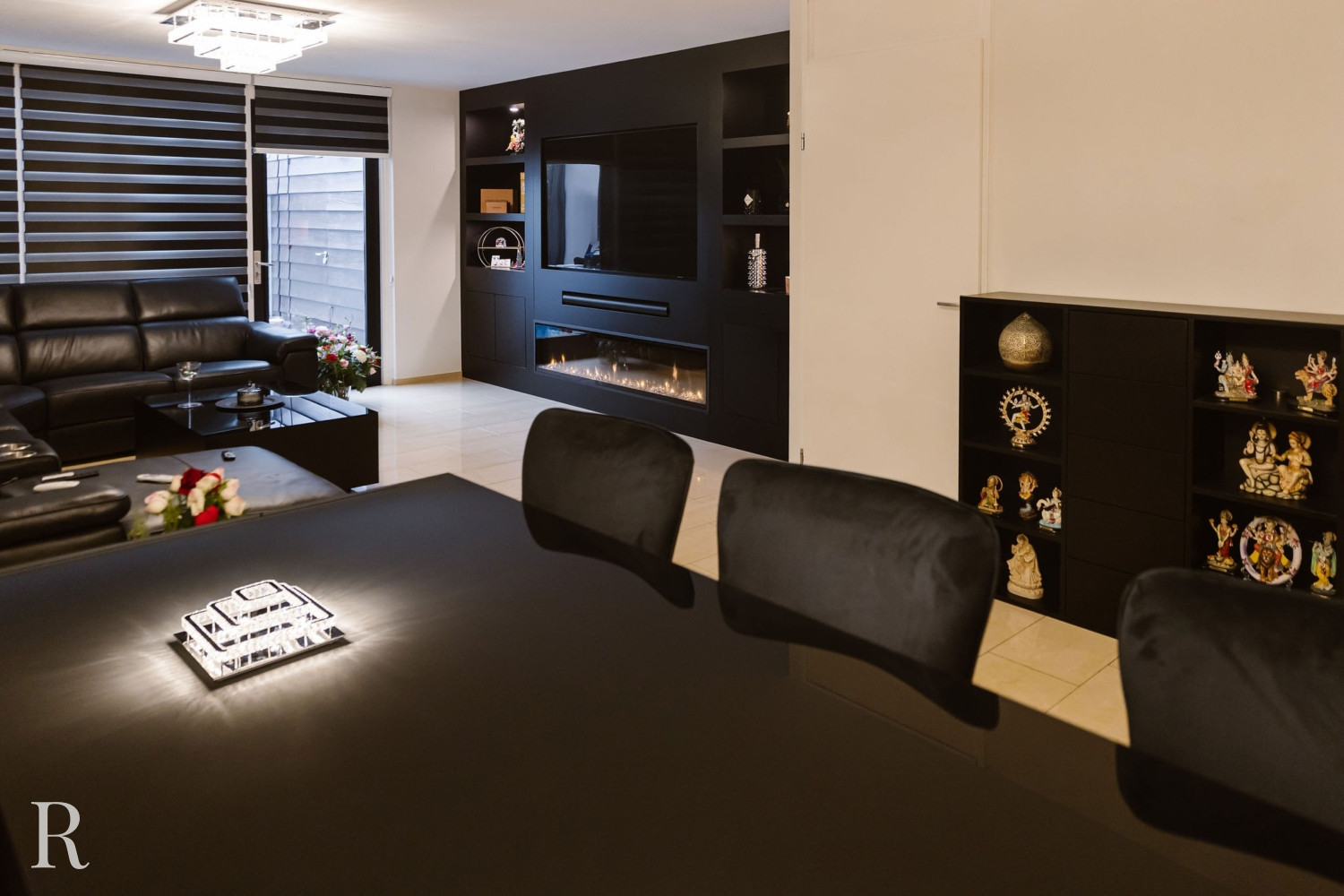 Naast een cinewall op maat maakten wij andere maatwerk meubels voor deze klant in Den Haag, zoals een hoogglans salontafel met lades, ladekast en een hoogglans eettafel met fluwelen eetkamerstoelen. De meubels passen perfect bij de zwarte, luxe hoekbank en de rustieke vloer: strak en modern.