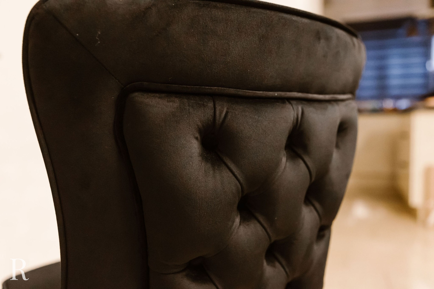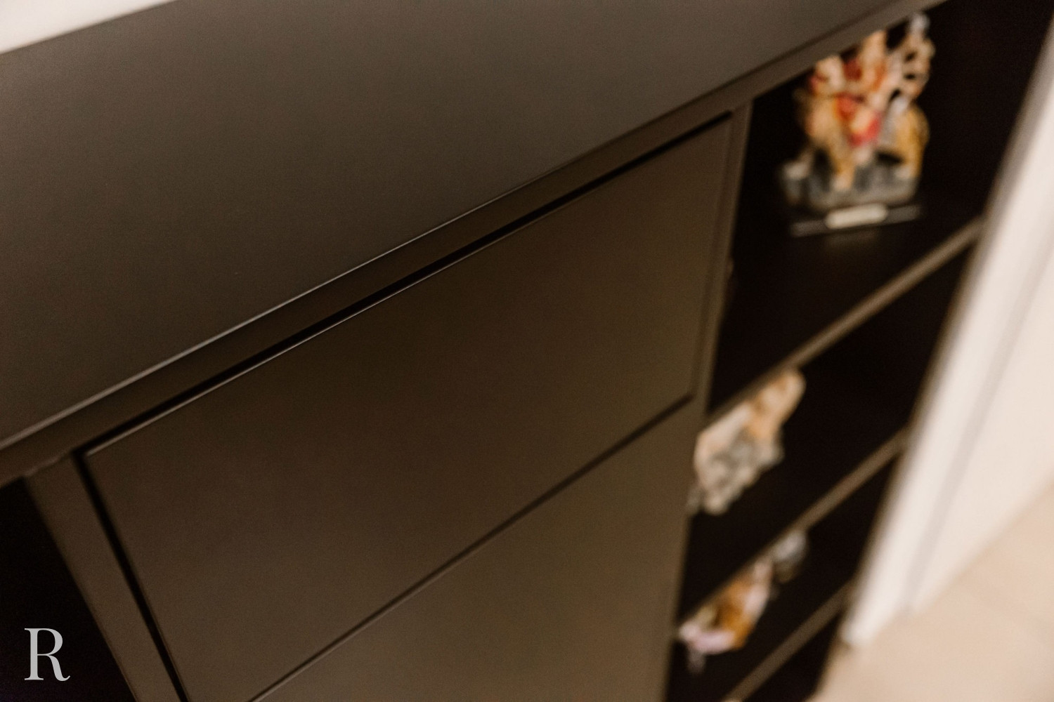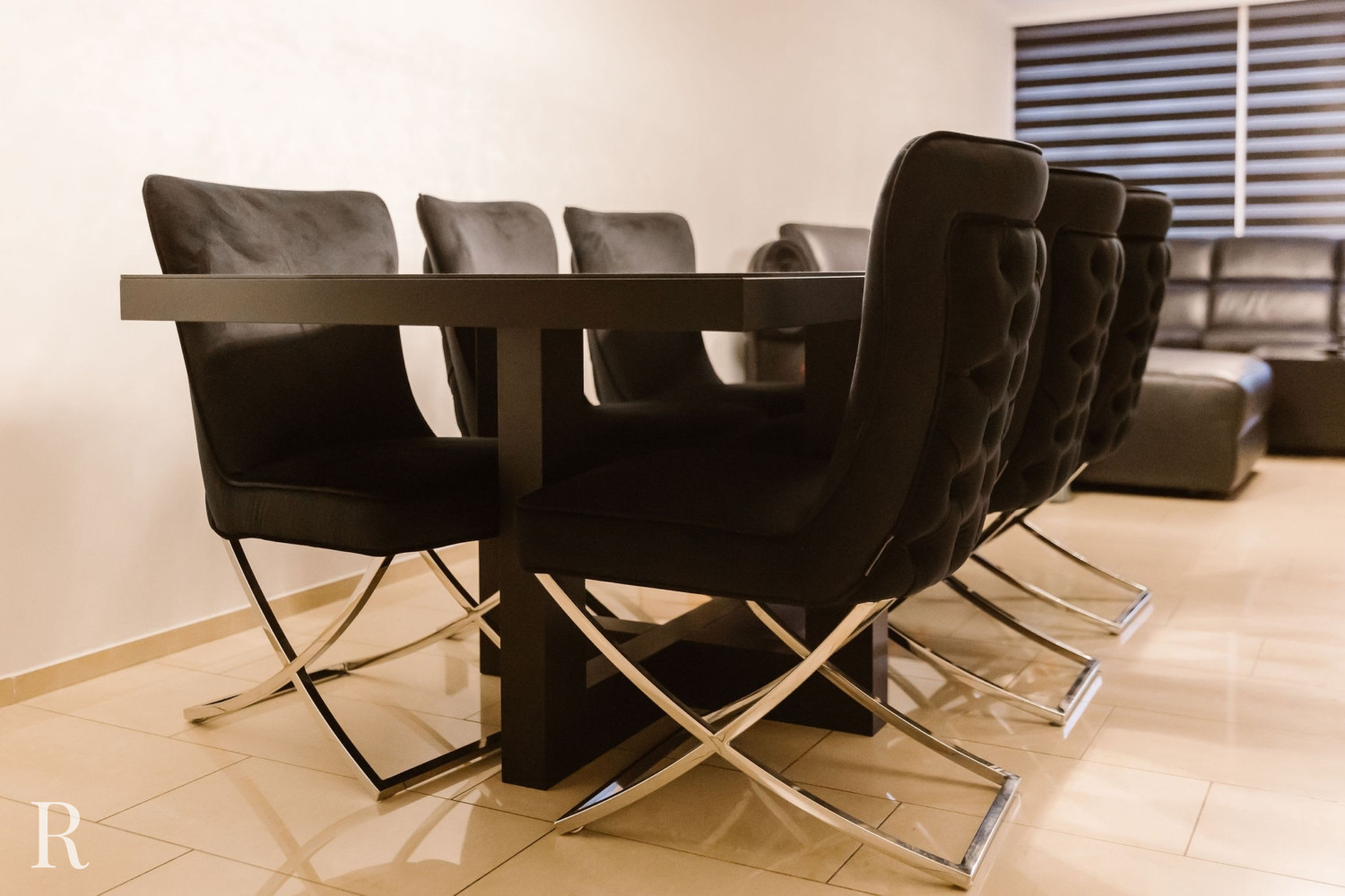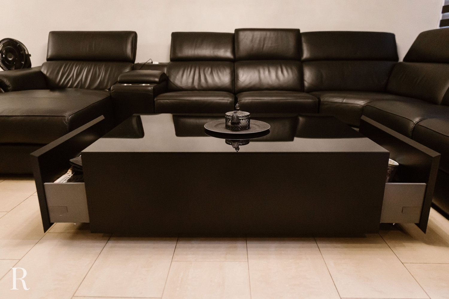Naast een cinewall op maat maakten wij andere maatwerk meubels voor deze klant in Den Haag, zoals een hoogglans salontafel met lades, ladekast en een hoogglans eettafel met fluwelen eetkamerstoelen. De meubels passen perfect bij de zwarte, luxe hoekbank en de rustieke vloer: strak en modern.