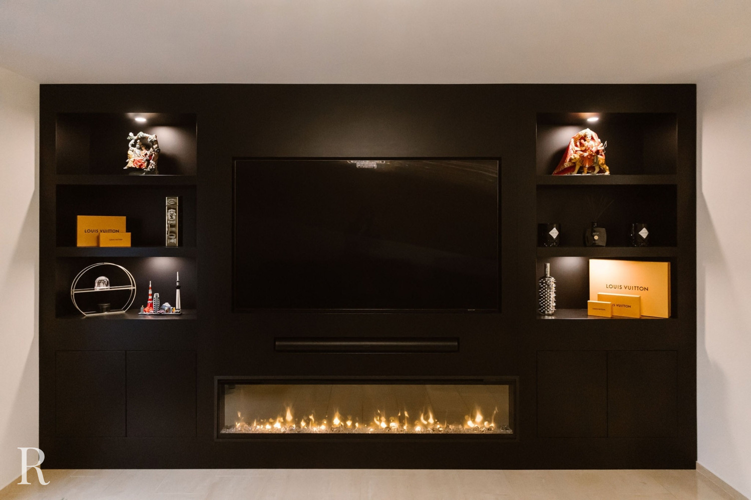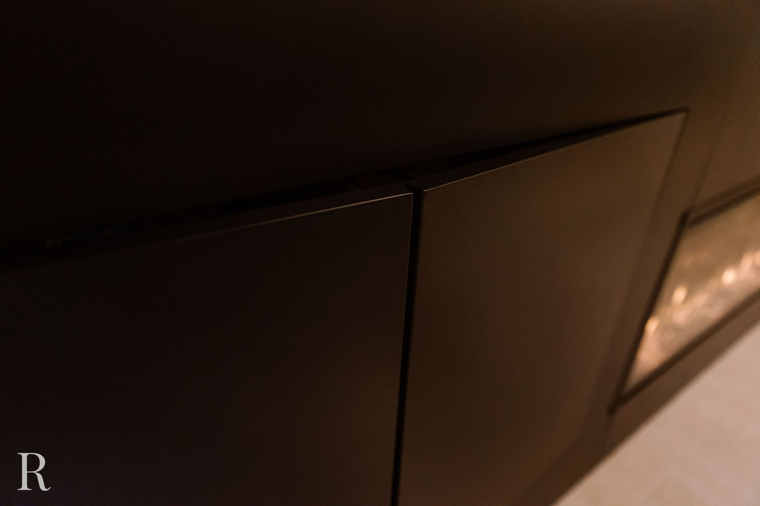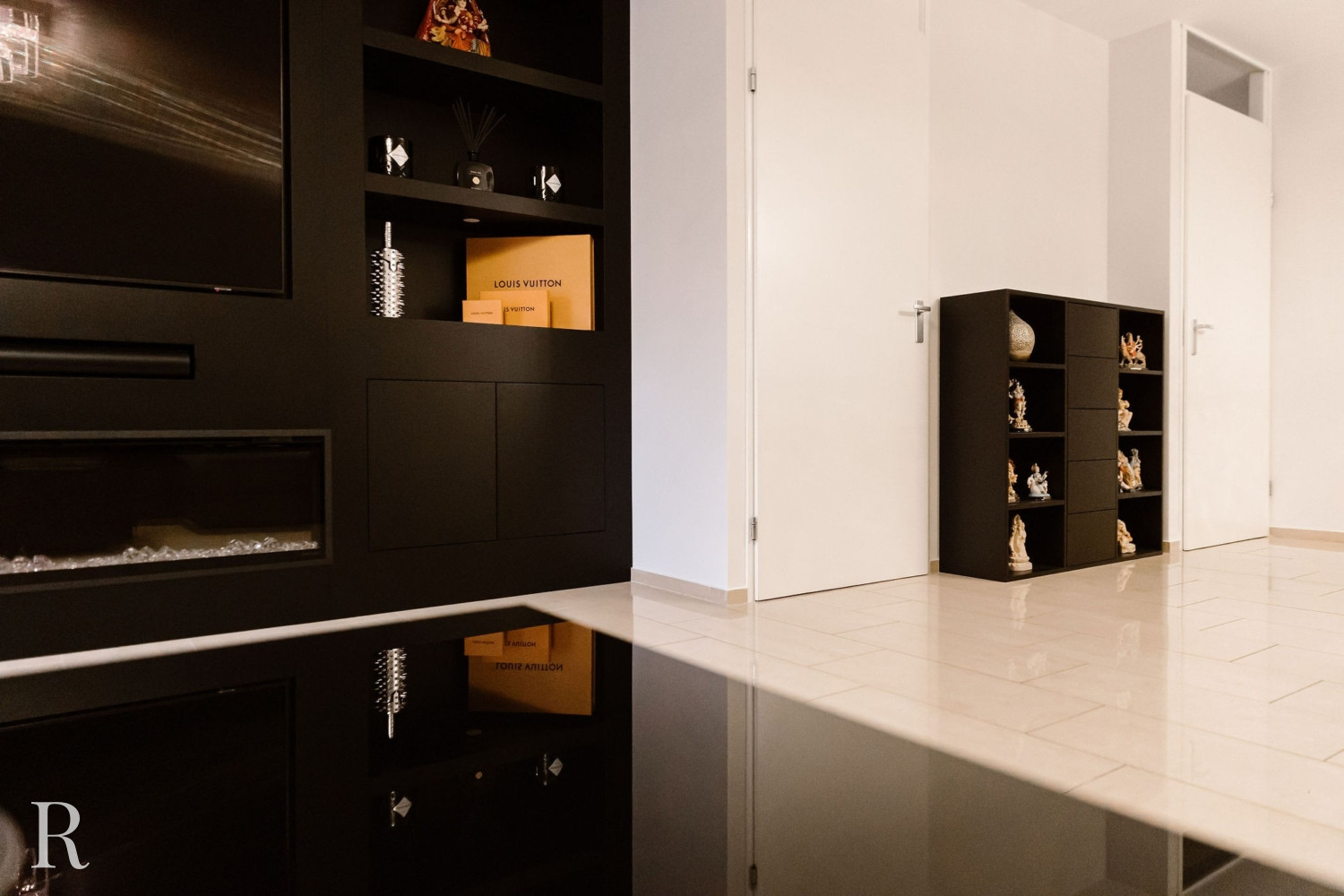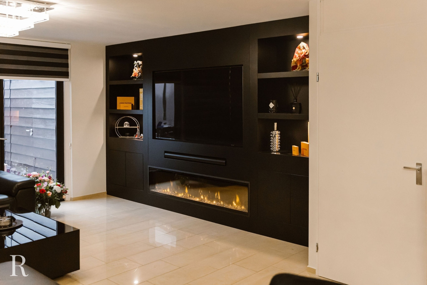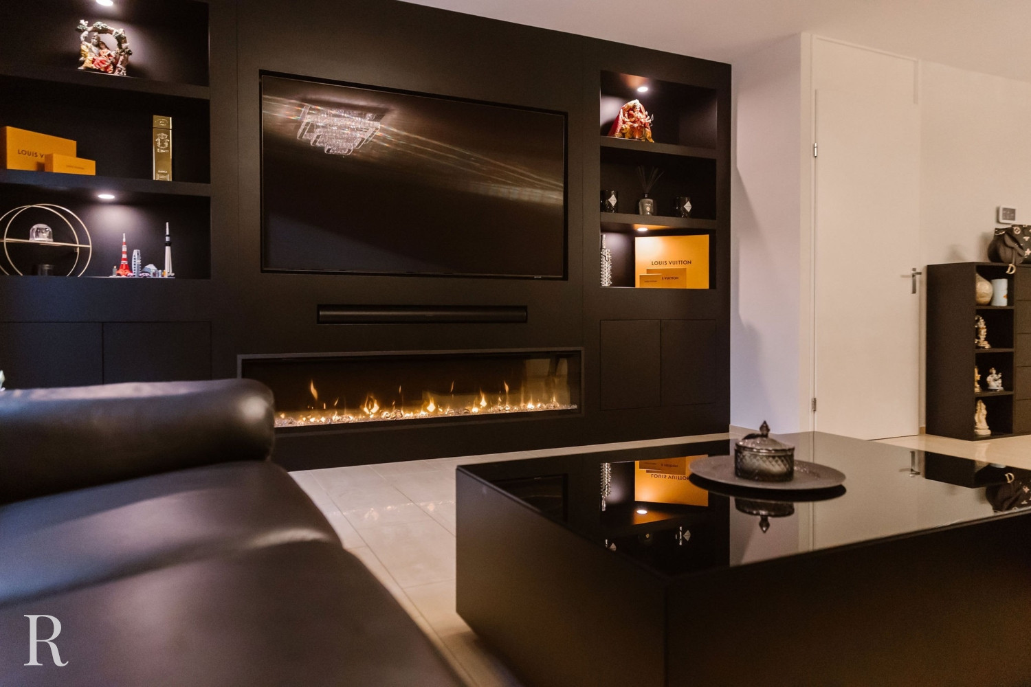 Om met de cinewall te beginnen; we maakten uitsparingen voor een flatscreen, soundbar en sfeerhaard. Het maatwerk meubel straalt klasse uit en maakt van iedere avond ‘bankhangen’ een heuse beleving!
