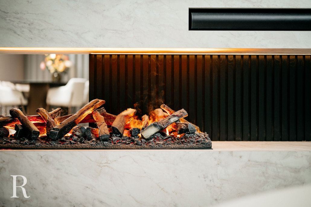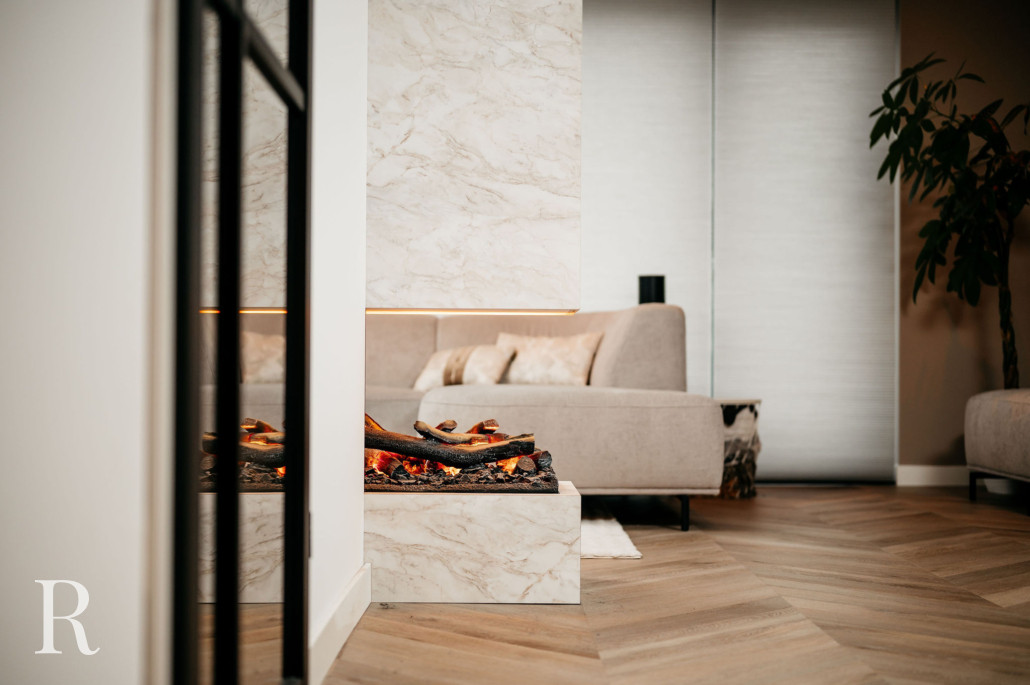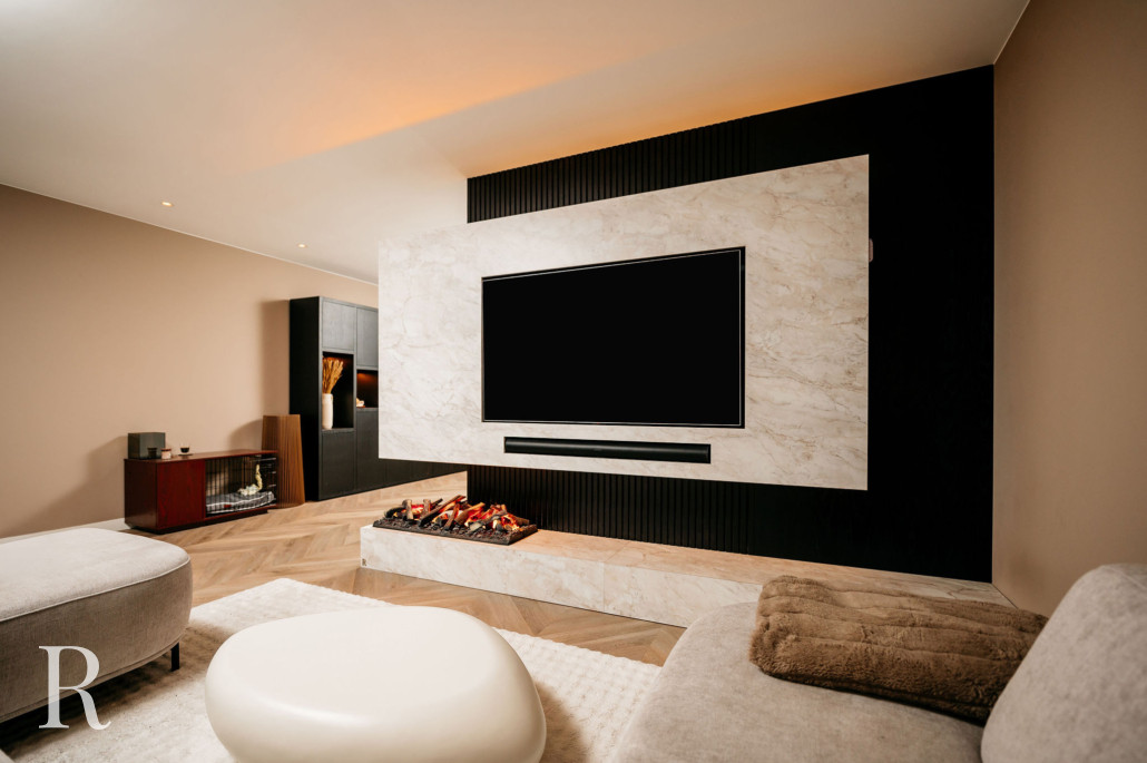 In Eindhoven realiseerden we een marmeren cinewall met sfeerhaard. Een harmonieus samenspel van luxe en warmte!