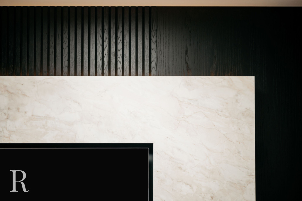 Deze cinewall ademt verfijning. De lijnen zijn strak, de afwerking perfect. Elk detail is maatwerk; van de houten lattenstructuur tot de exact ingepaste tv. Het lichte marmer met zijn subtiele, gouden aders, geeft de wand een natuurlijke, tijdloze uitstraling. De diepzwarte houten structuur brengt diepte in het ontwerp.