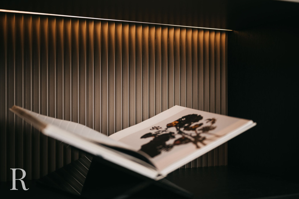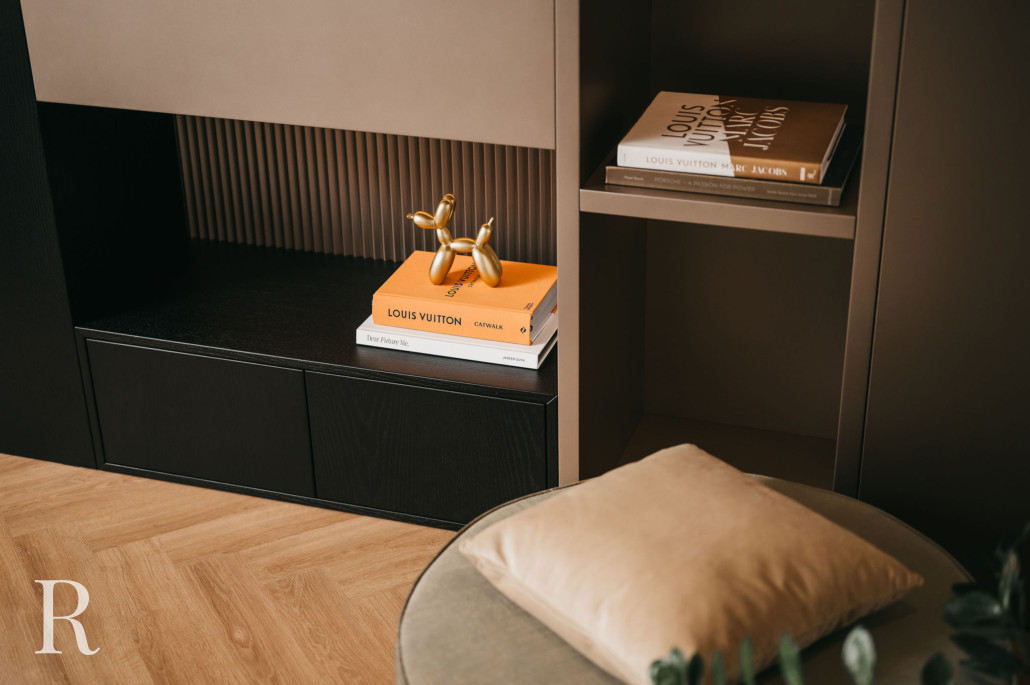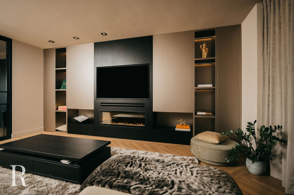 De toon is gezet, en die voerden we ook door in een andere ruimte. Daar realiseerden we een ‘miniversie’ van de cinewall. Het past perfect in deze knusse hoek. Taupe tinten, open vakken en sfeervolle spots. Het meubel is met zorg samengesteld. Houten planken breken het strakke oppervlak. Het geheel voelt intiem, maar toch ruimtelijk.