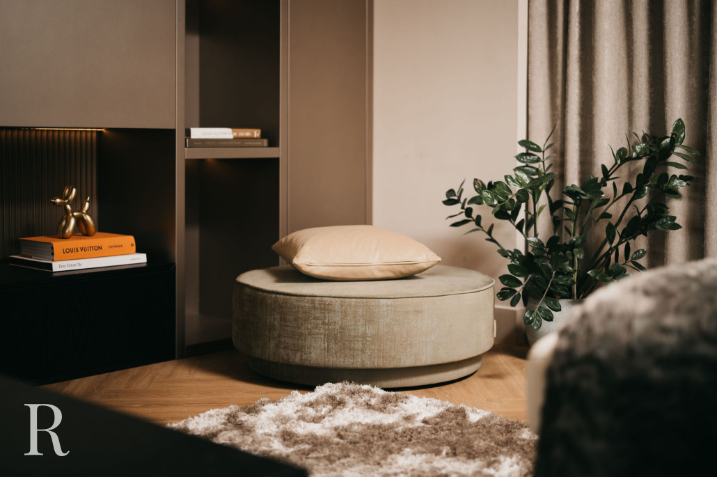 Dat geldt ook voor de rest van het interieur. De salontafel heeft een blokvorm, gemaakt van hetzelfde hout als de cinewall. De focus ligt op de strakke belijning, daarom voegden we ook ‘zachte’ items toe. Bijvoorbeeld de chique bank, met fluwelen stof en kussens.