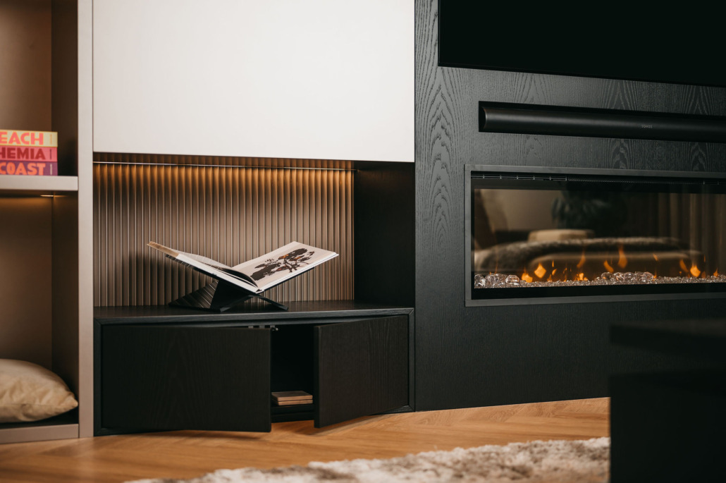 Taupe tinten en diepzwart hout. Gladde afwerking en verfijnde houtstructuur. Open vakken en gesloten kasten. Deze cinewall is in balans. Het meubel verrijkt, of sterker nog, definieert de ruimte. Met in het hart: de flatscreen tv, soundbar en sfeerhaard. Technologie en design smelten samen.