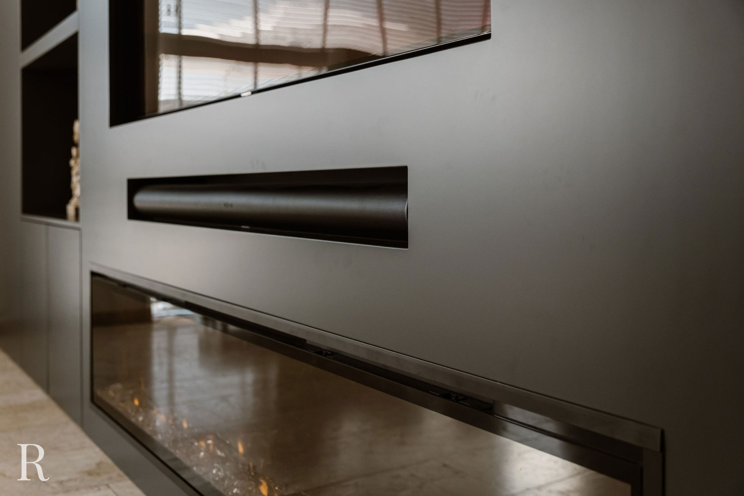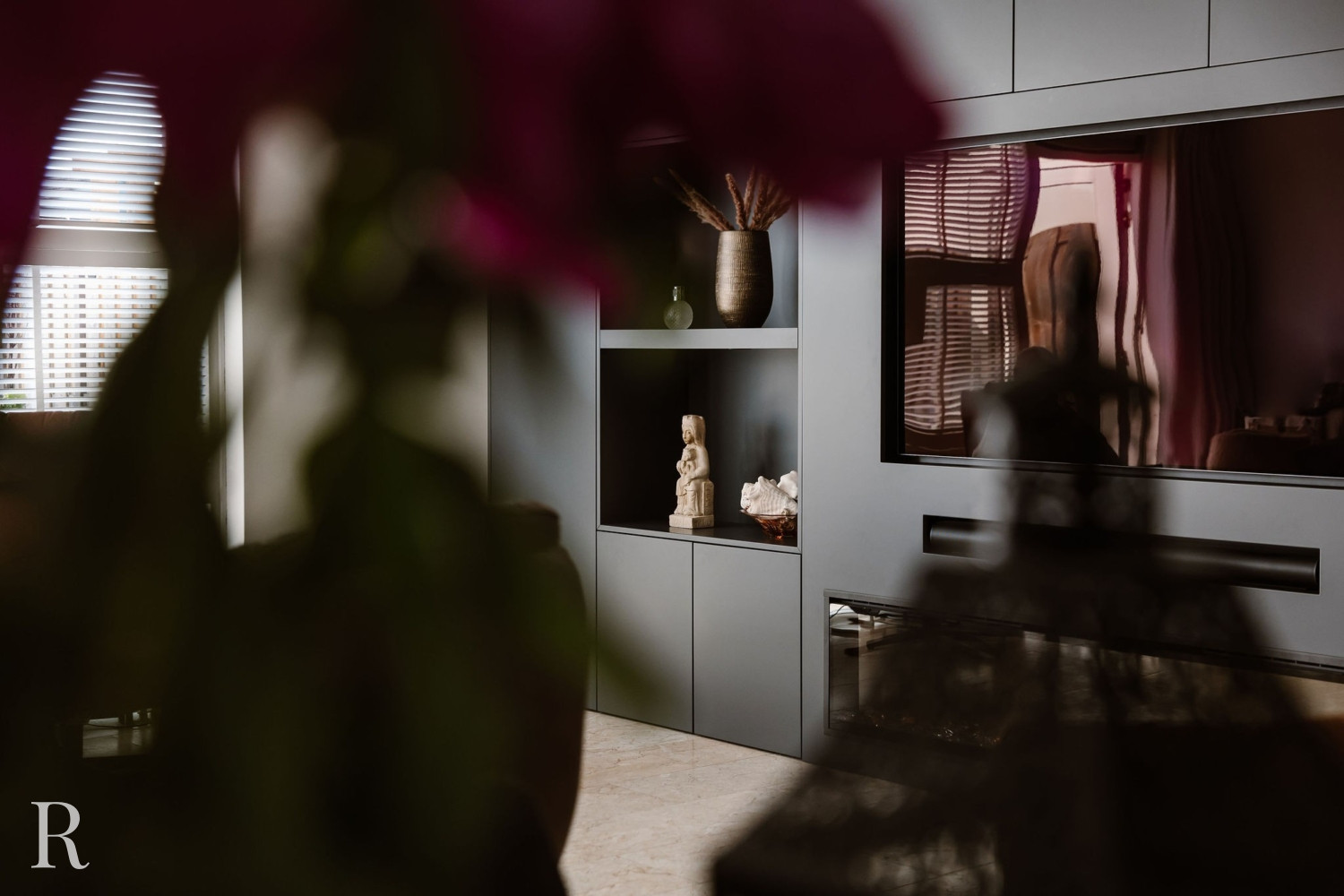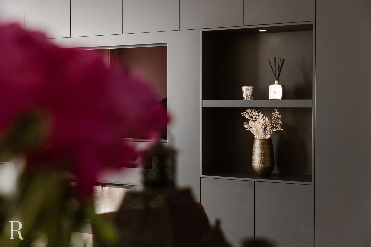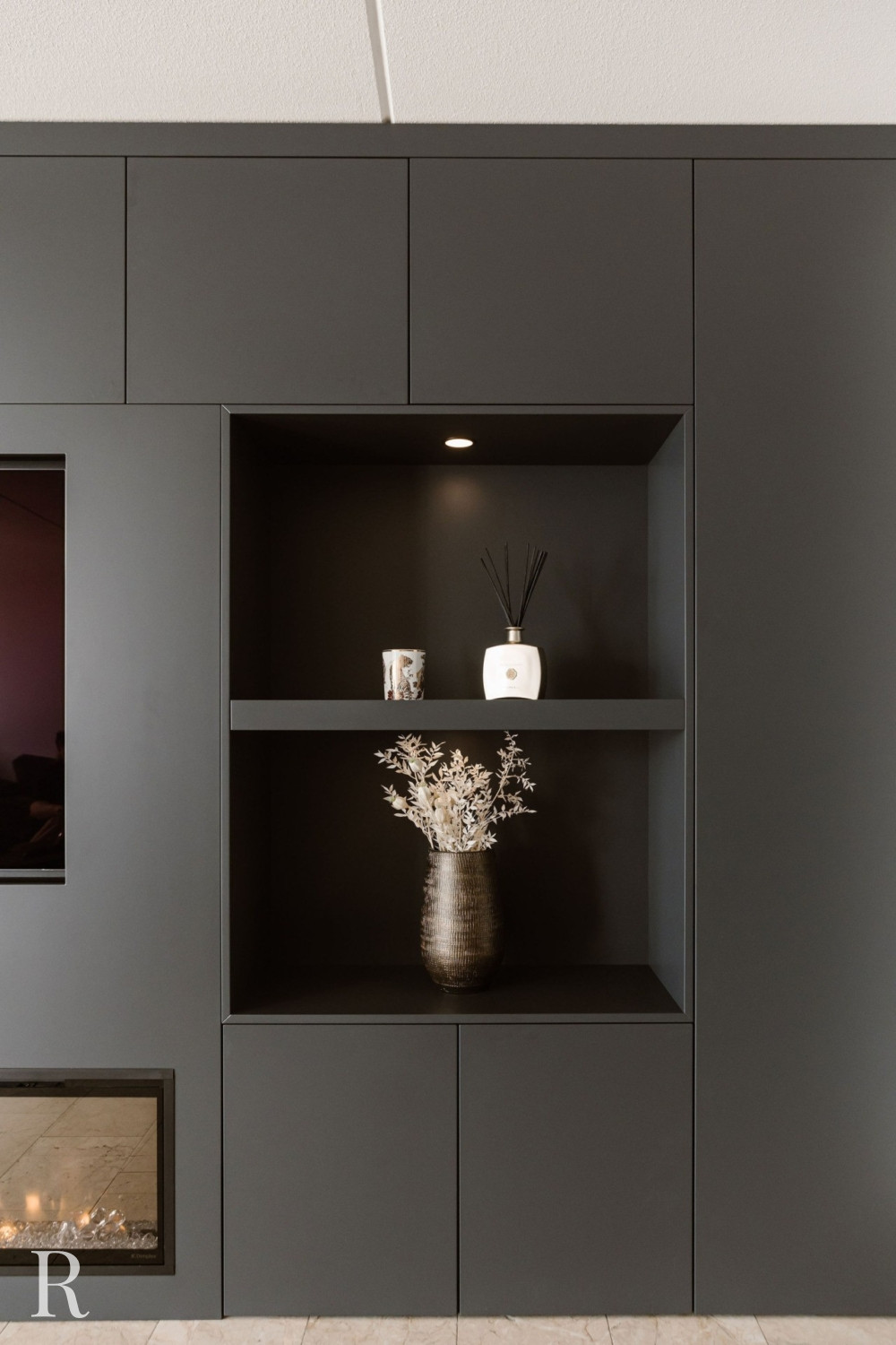 Deze cinewall heeft flink wat opbergruimte. Het is de ideale manier om ‘visuele rommel’ weg te werken. Schitterend én praktisch: een gouden combinatie wat ons betreft.