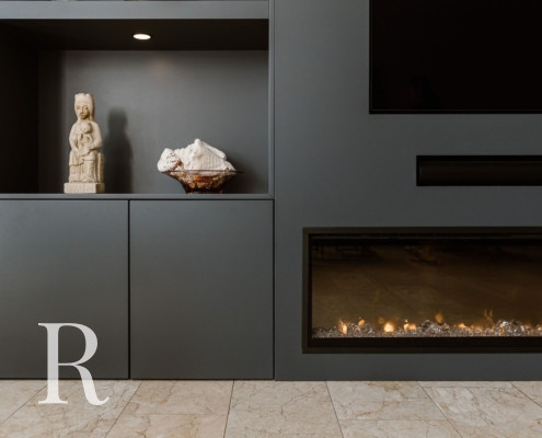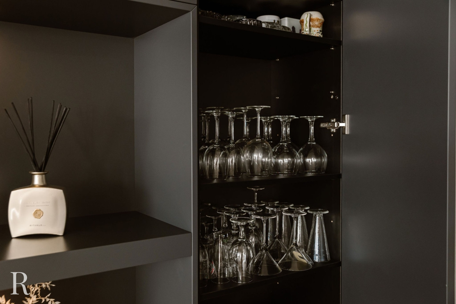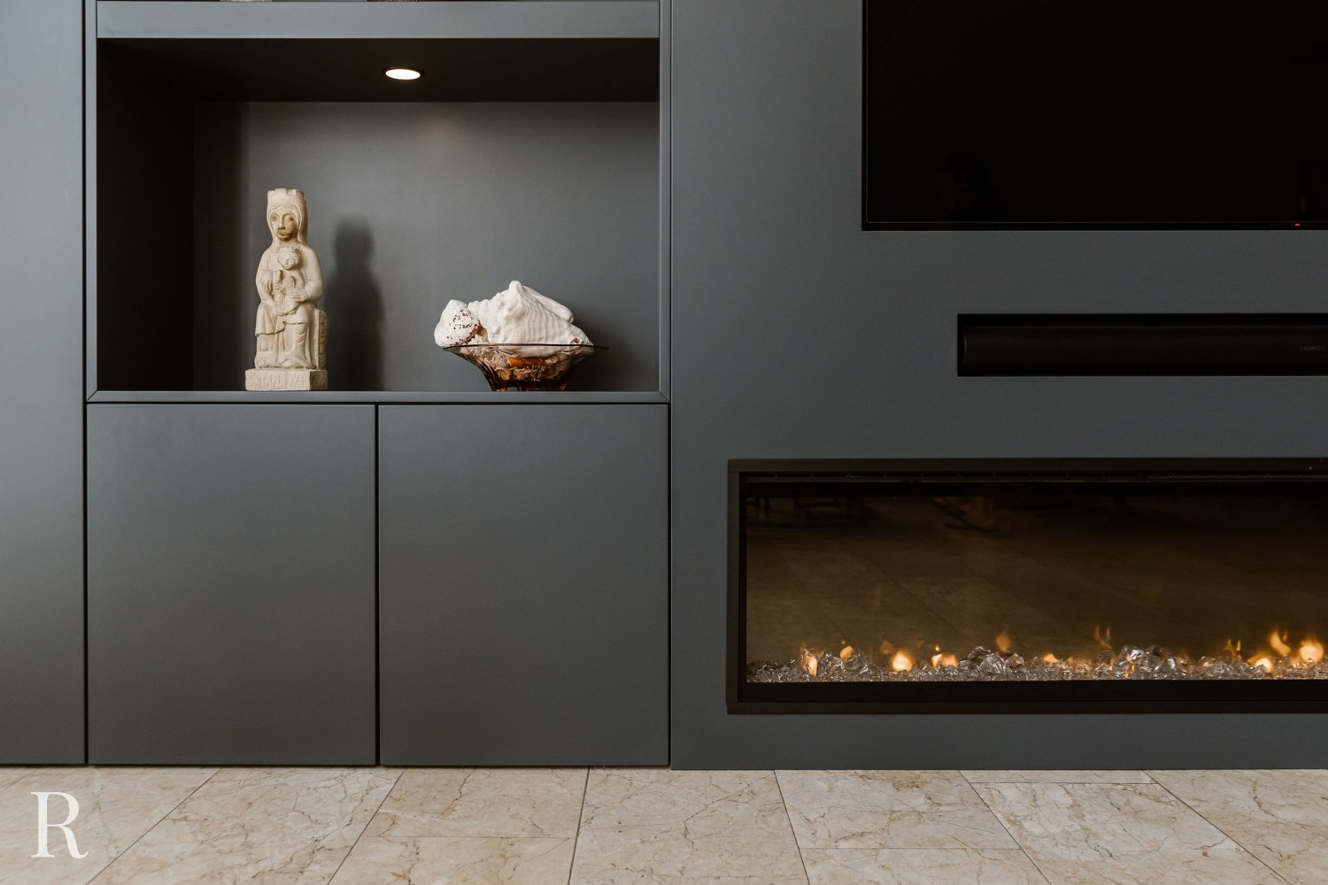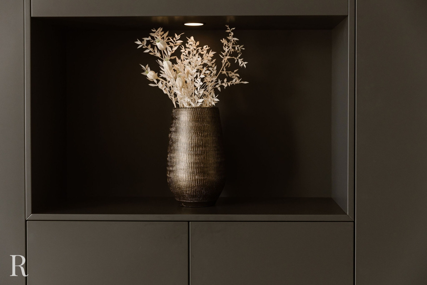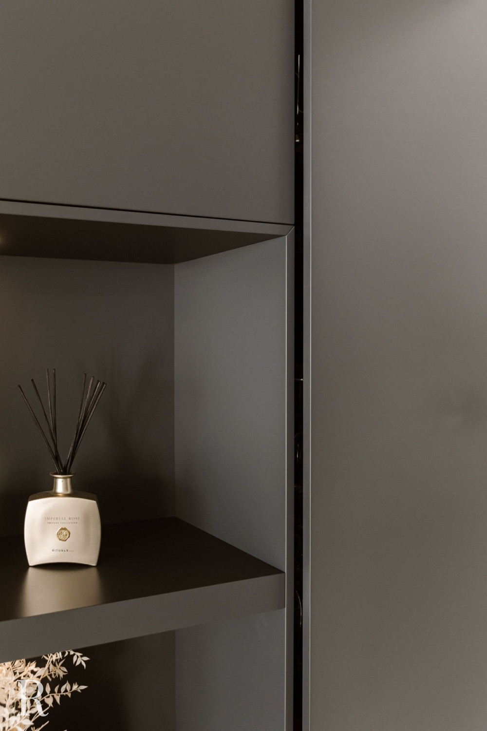 Deze cinewall heeft flink wat opbergruimte. Het is de ideale manier om ‘visuele rommel’ weg te werken. Schitterend én praktisch: een gouden combinatie wat ons betreft.
