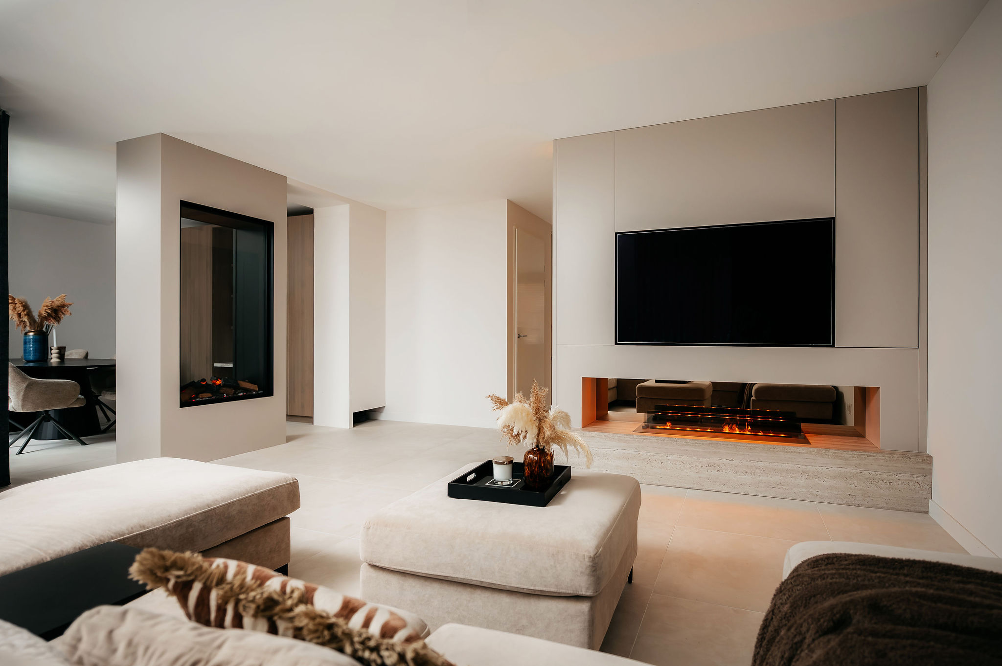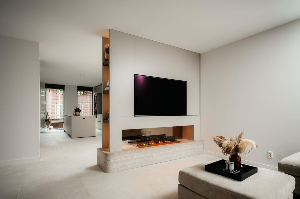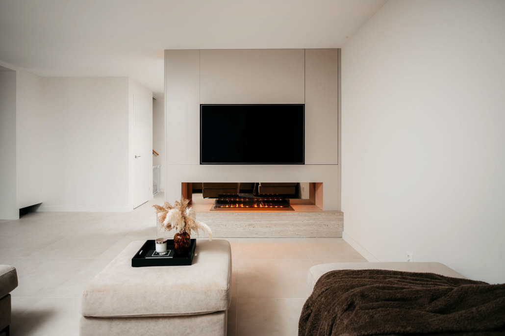 Dit project laat zien hoe een cinewall de sfeer en beleving van een woonkamer kan transformeren. In combinatie met de doorkijkhaard en het doorlopende materiaalgebruik ontstaat een samenhangend geheel waarin rust, luxe en functionaliteit samenkomen.