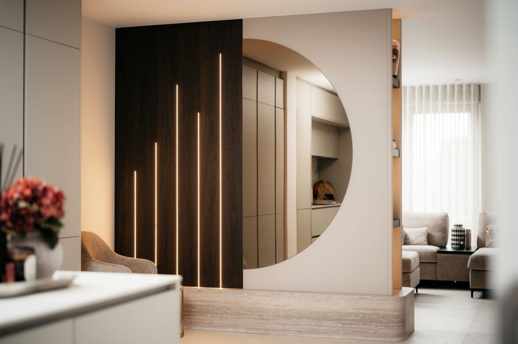 Een high-end bioscoopervaring in eigen woonkamer. Voor dit project realiseerden wij een luxe maatwerk cinewall met duidelijke invloeden uit Japandi en soft minimalism. Neutrale tinten, warme verlichting en een ondermeubel met travertinlook geven de wand een verfijnde, luxueuze uitstraling. Niet enkel een tv-meubel, maar een architectonisch element dat de ruimte op een stijlvolle manier verdeelt.
