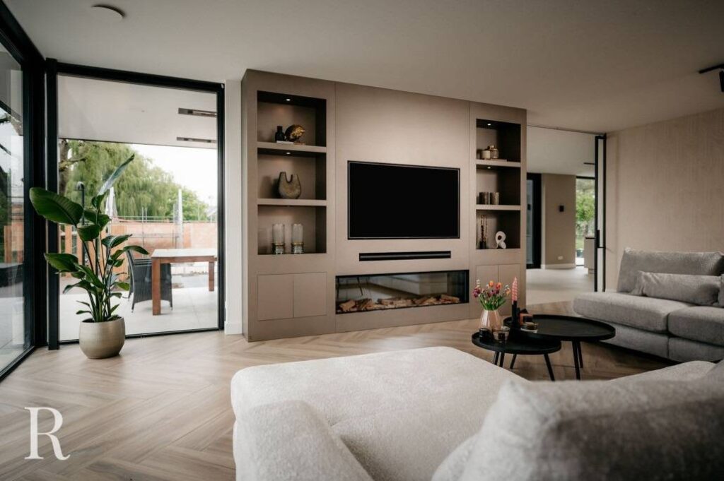In Hendrik-Ido-Ambacht realiseerden we een taupe cinewall met sfeerhaard. Een perfect samenspel van rust, symmetrie en verfijning.