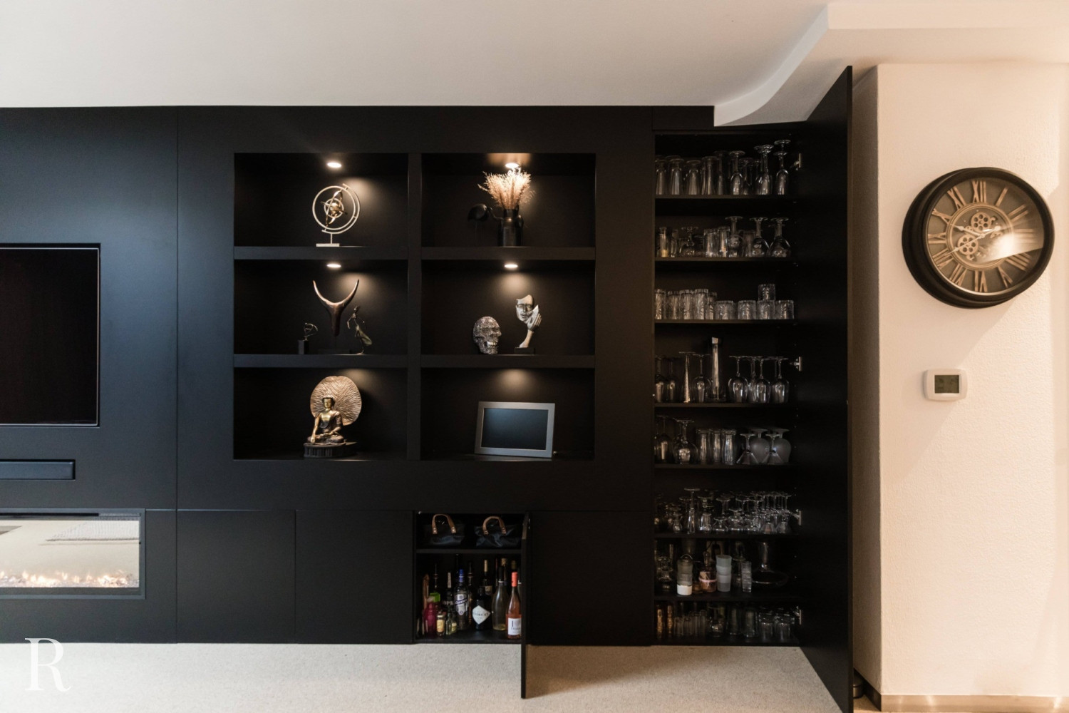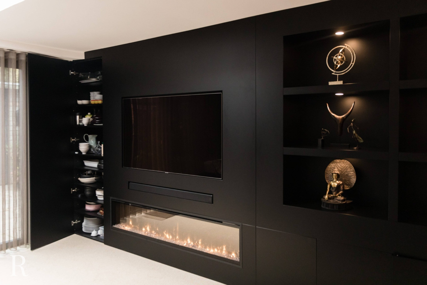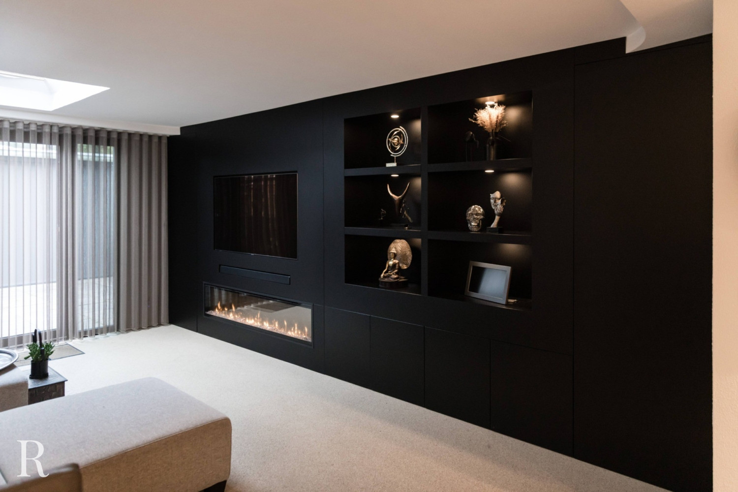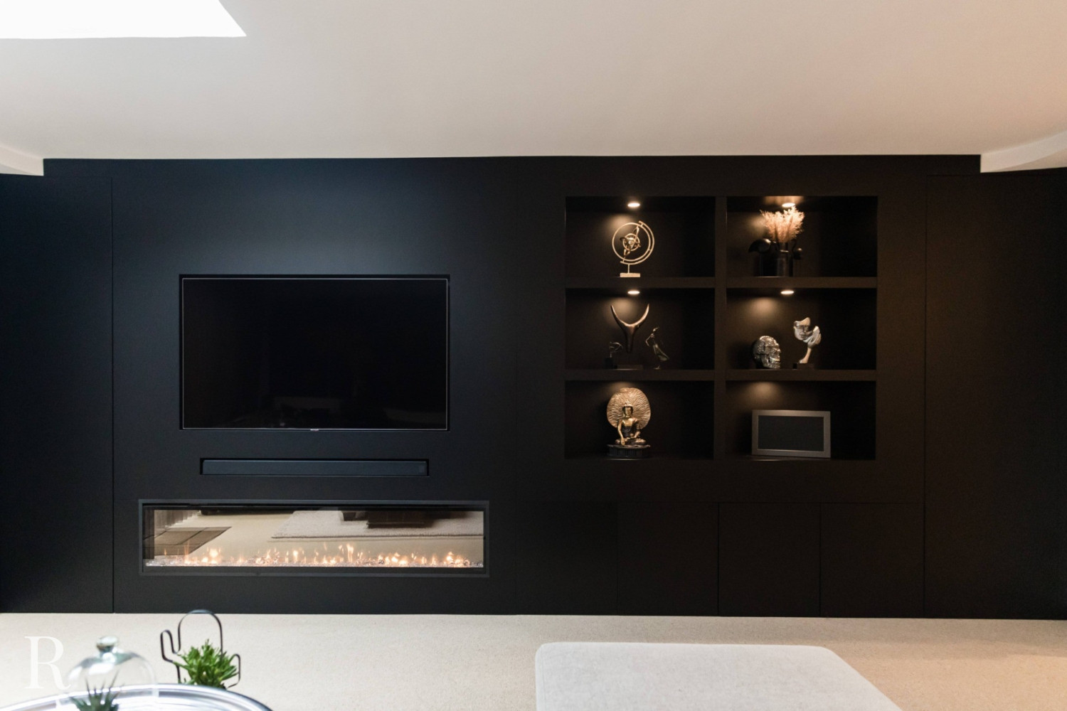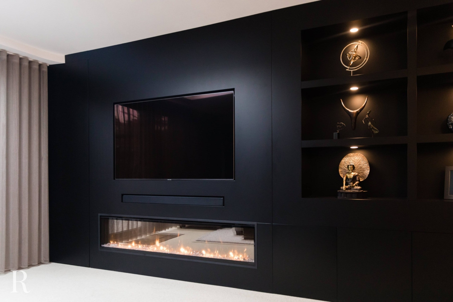 Voor deze klant in Nijmegen bouwden we een strakke plafondhoge tv-wand. De zwarte cinewall vormt een perfect plaatje in het interieur.