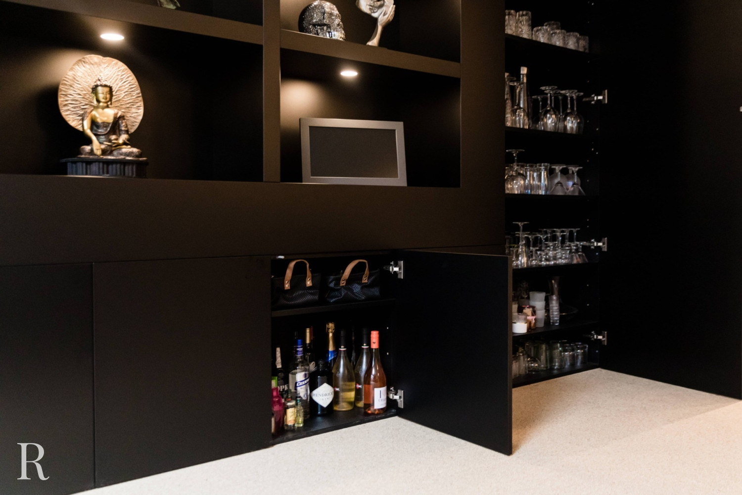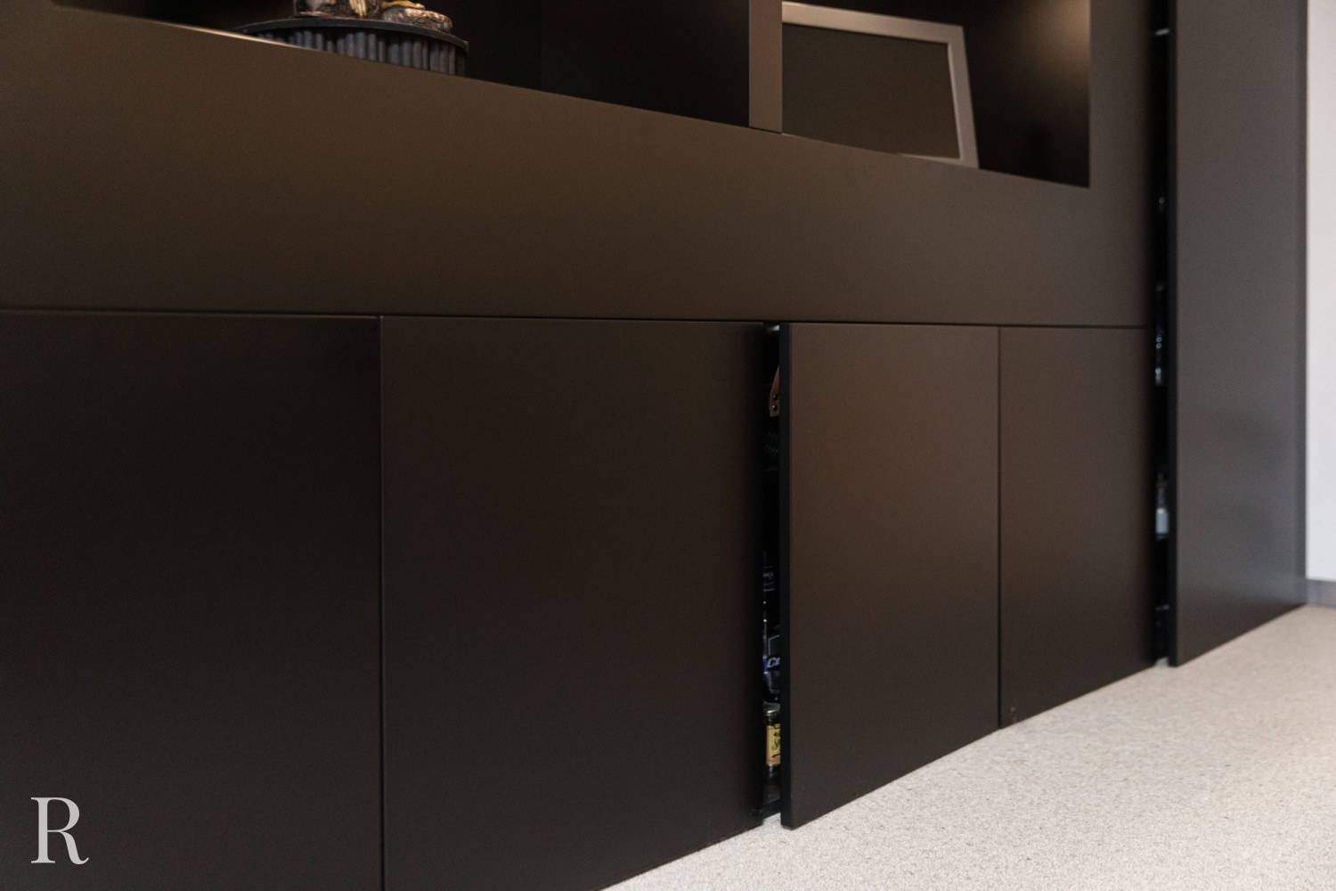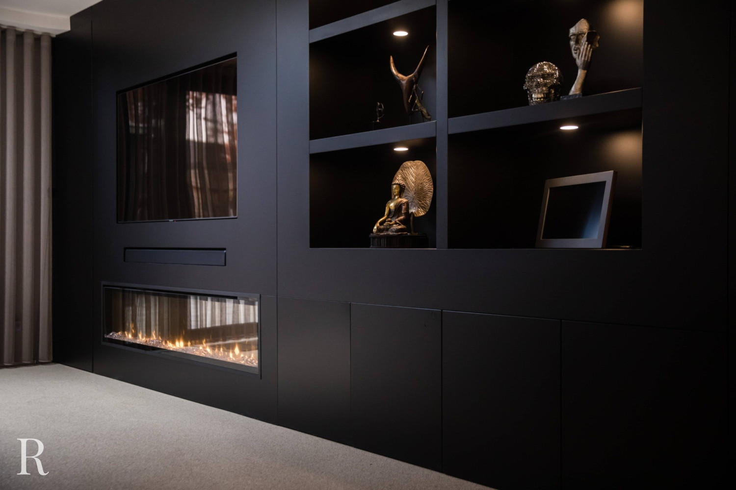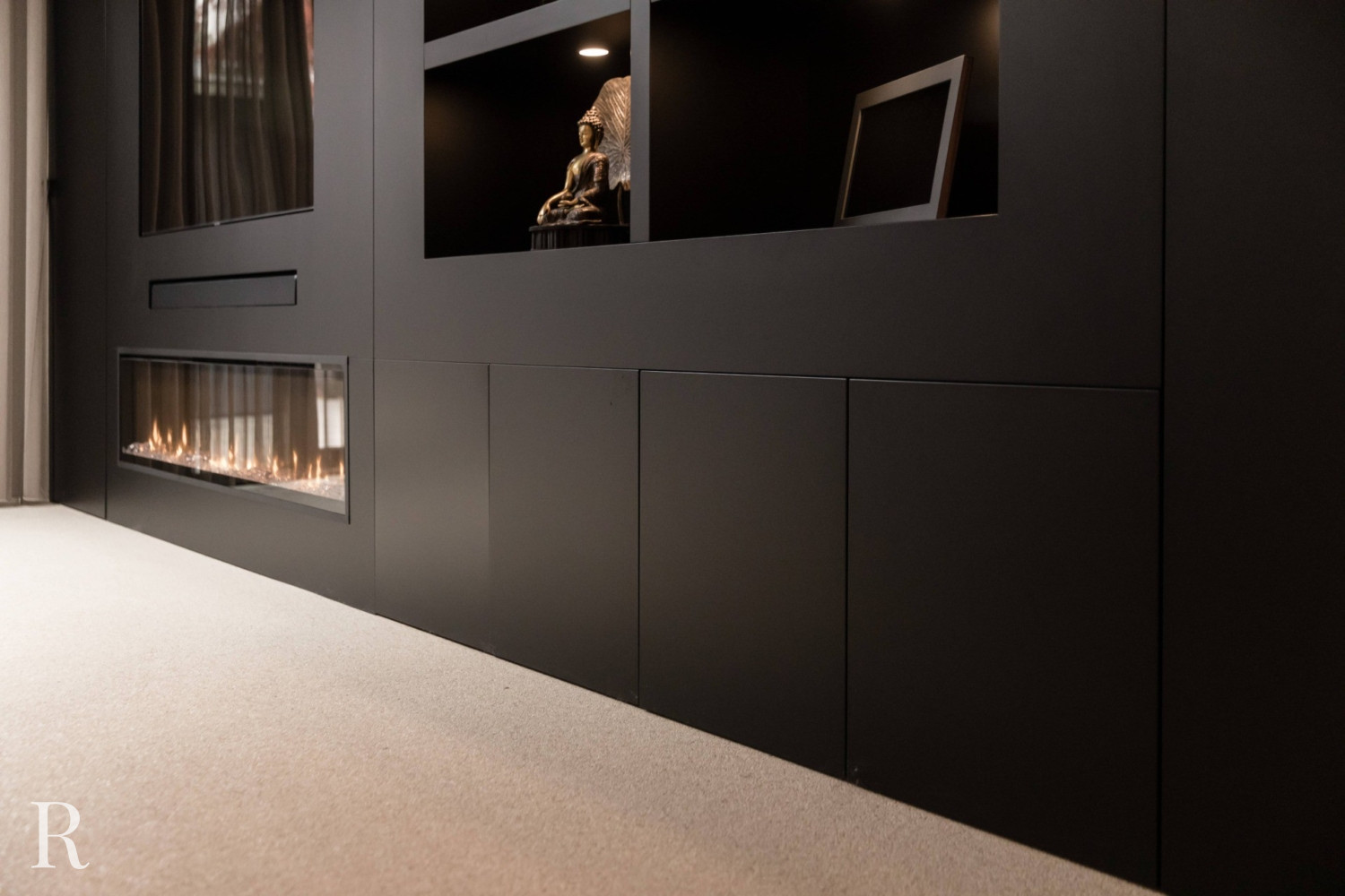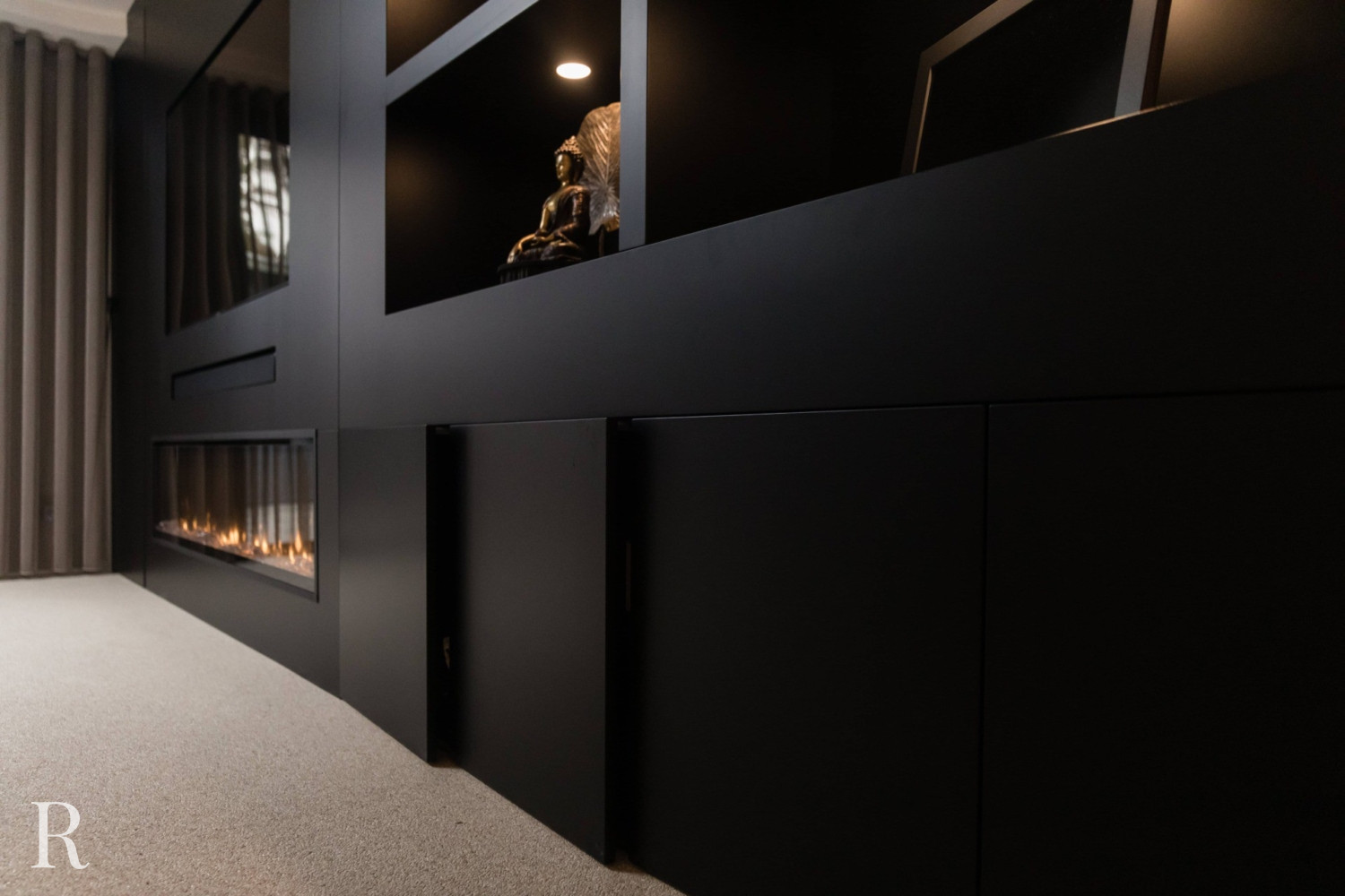 Voor deze klant in Nijmegen bouwden we een strakke plafondhoge tv-wand. De zwarte cinewall vormt een perfect plaatje in het interieur.