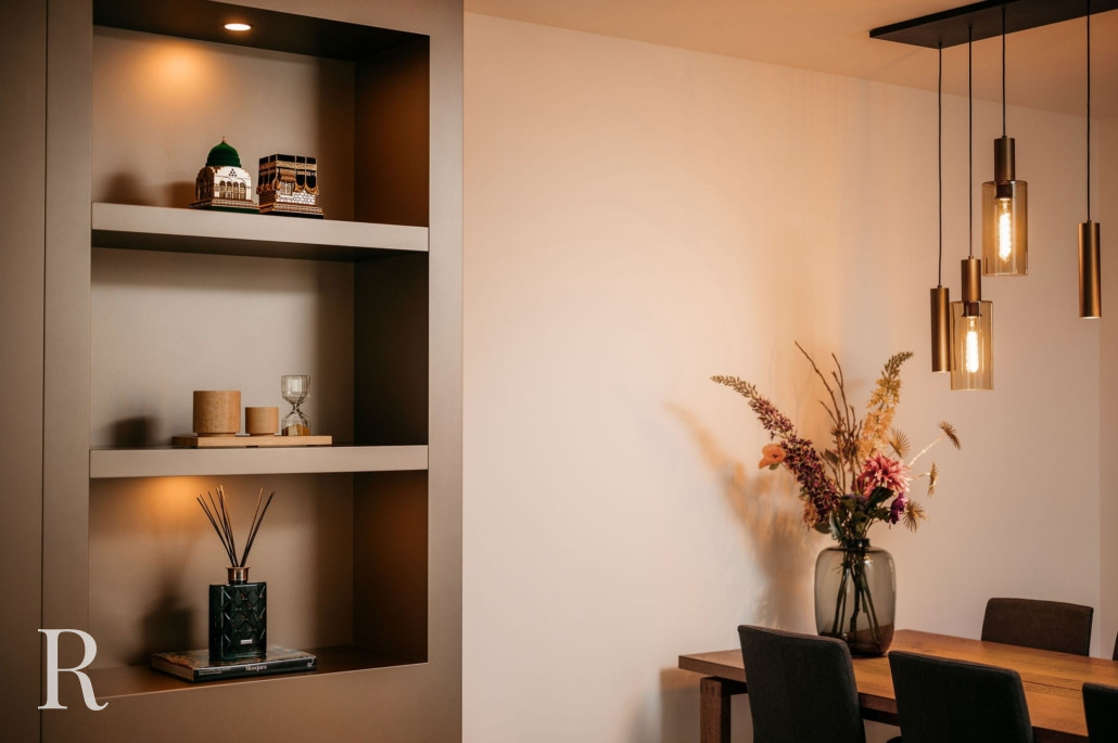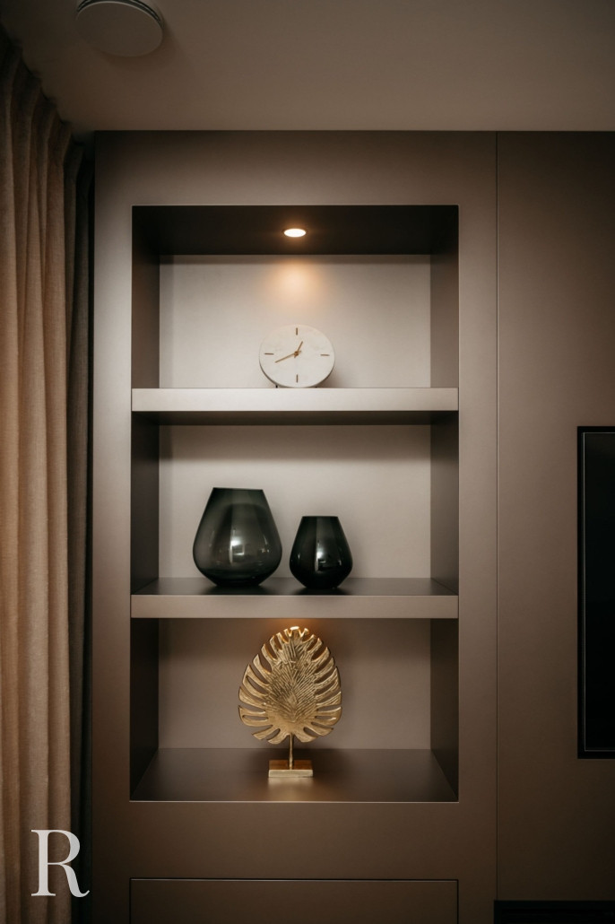Aan beide zijden van de tv zijn gesloten lades en open vakken te vinden. Met een luxe huisparfum, exclusieve koffietafelboeken en bijzondere vazen maakt u de cinewall eigen. Verlicht met sfeervolle spots. Een prachtig vormgegeven wand!