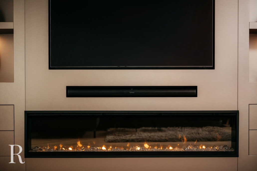 De basis van een cinewall is doorgaans het drieluik: tv, soundbar en sfeerhaard. Dat kan niet misgaan. Veel klanten kiezen ook voor voldoende opbergruimte. Wilt u het meubel zo strak mogelijk houden, dan kunt u de kasten het beste symmetrisch laten plaatsen. Daar kozen deze bewoners ook voor.