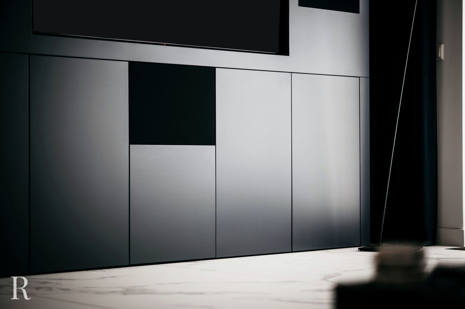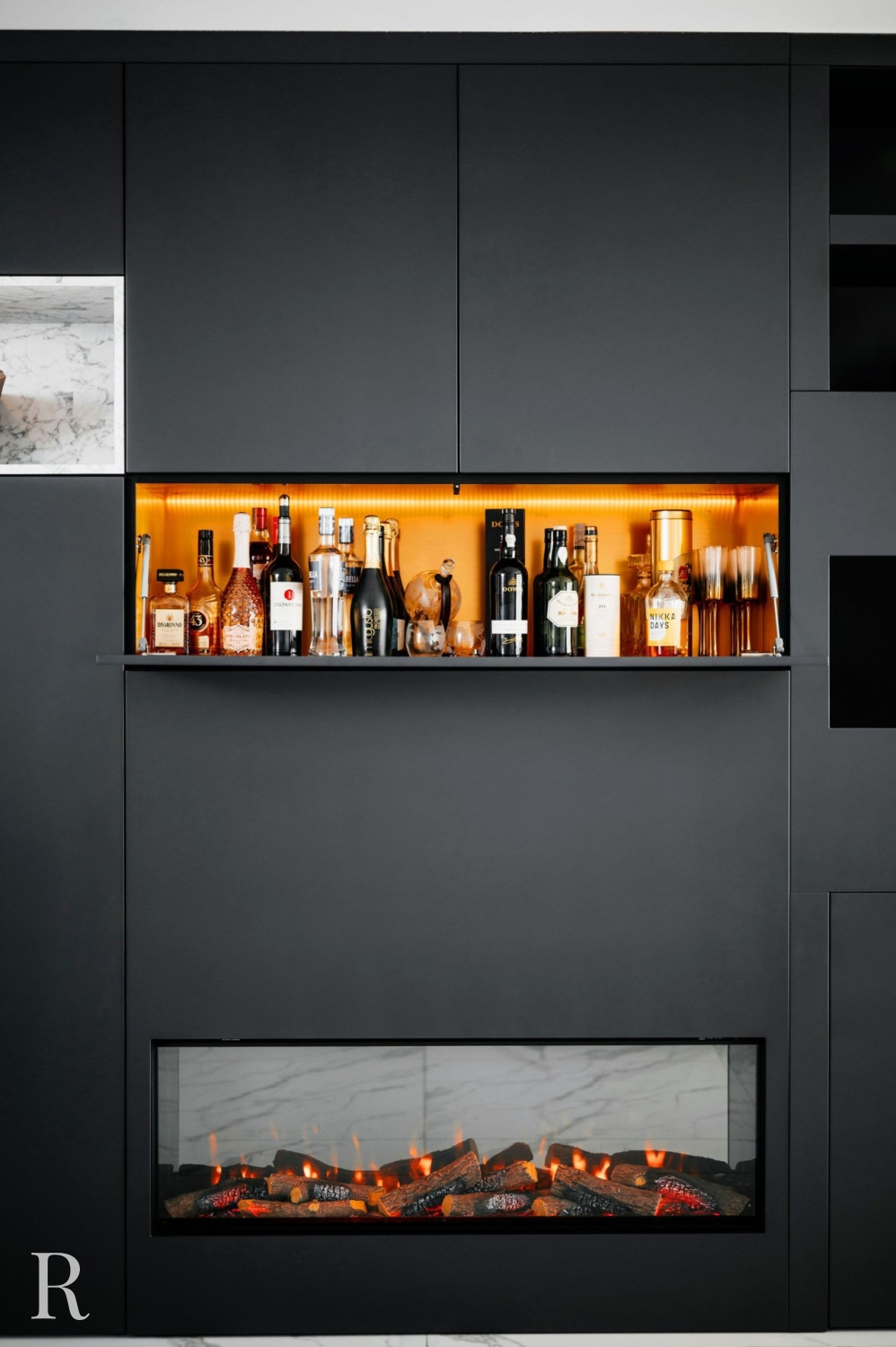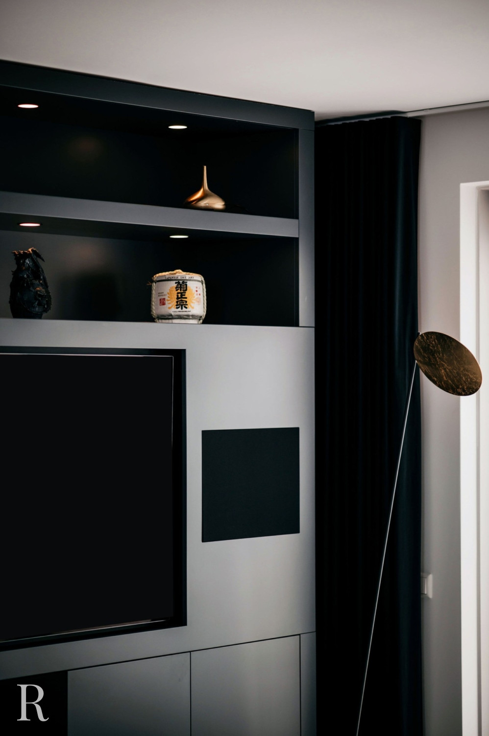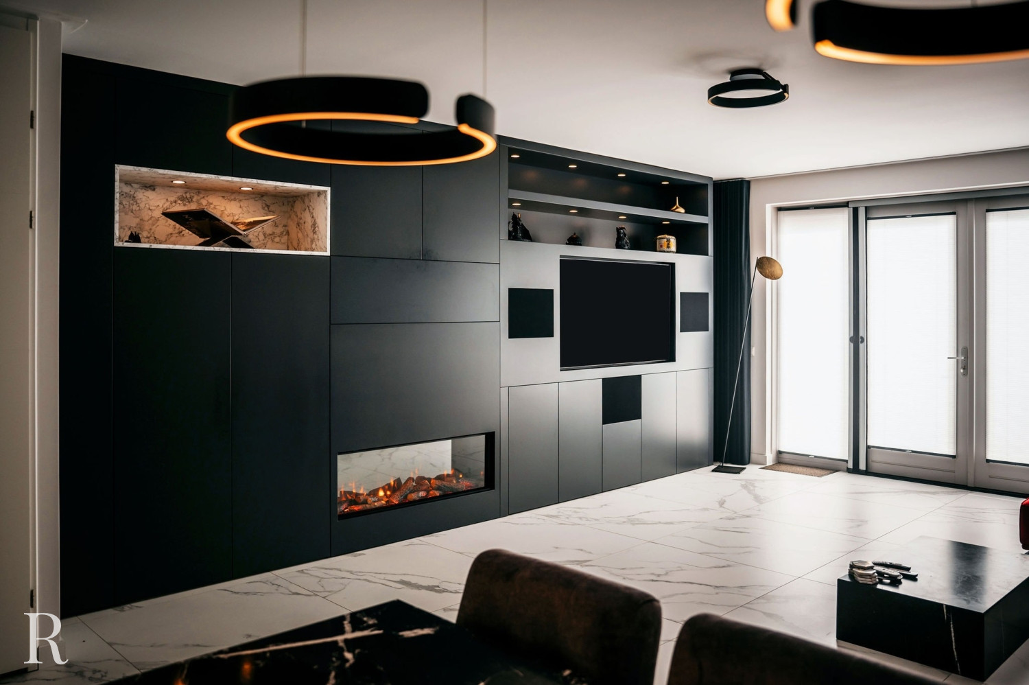 De elektrische sfeerhaard biedt niet alleen warmte, maar functioneert ook als een artistiek element. Het creëert een ambiance van comfort en luxe. Daarboven trekt een inbouwnis de aandacht. Het witte marmer doorbreekt het zwarte oppervlak en verbindt de cinewall met de vloer.