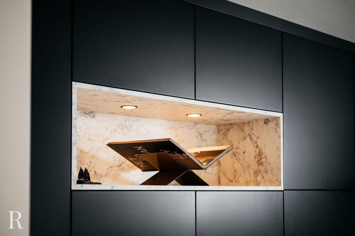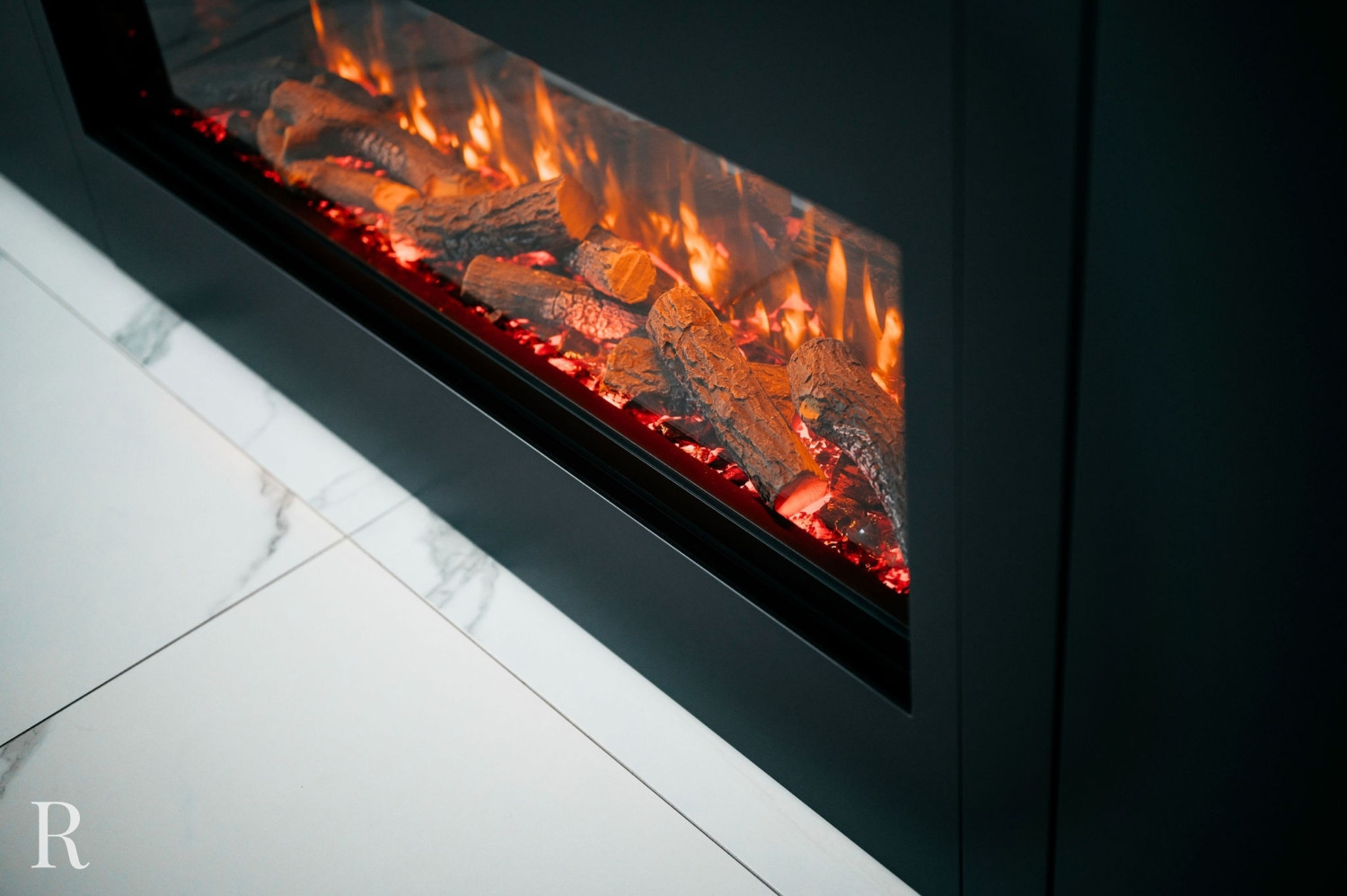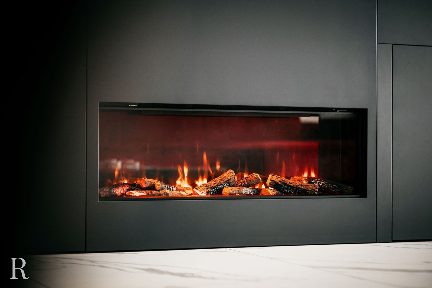 De elektrische sfeerhaard biedt niet alleen warmte, maar functioneert ook als een artistiek element. Het creëert een ambiance van comfort en luxe. Daarboven trekt een inbouwnis de aandacht. Het witte marmer doorbreekt het zwarte oppervlak en verbindt de cinewall met de vloer.