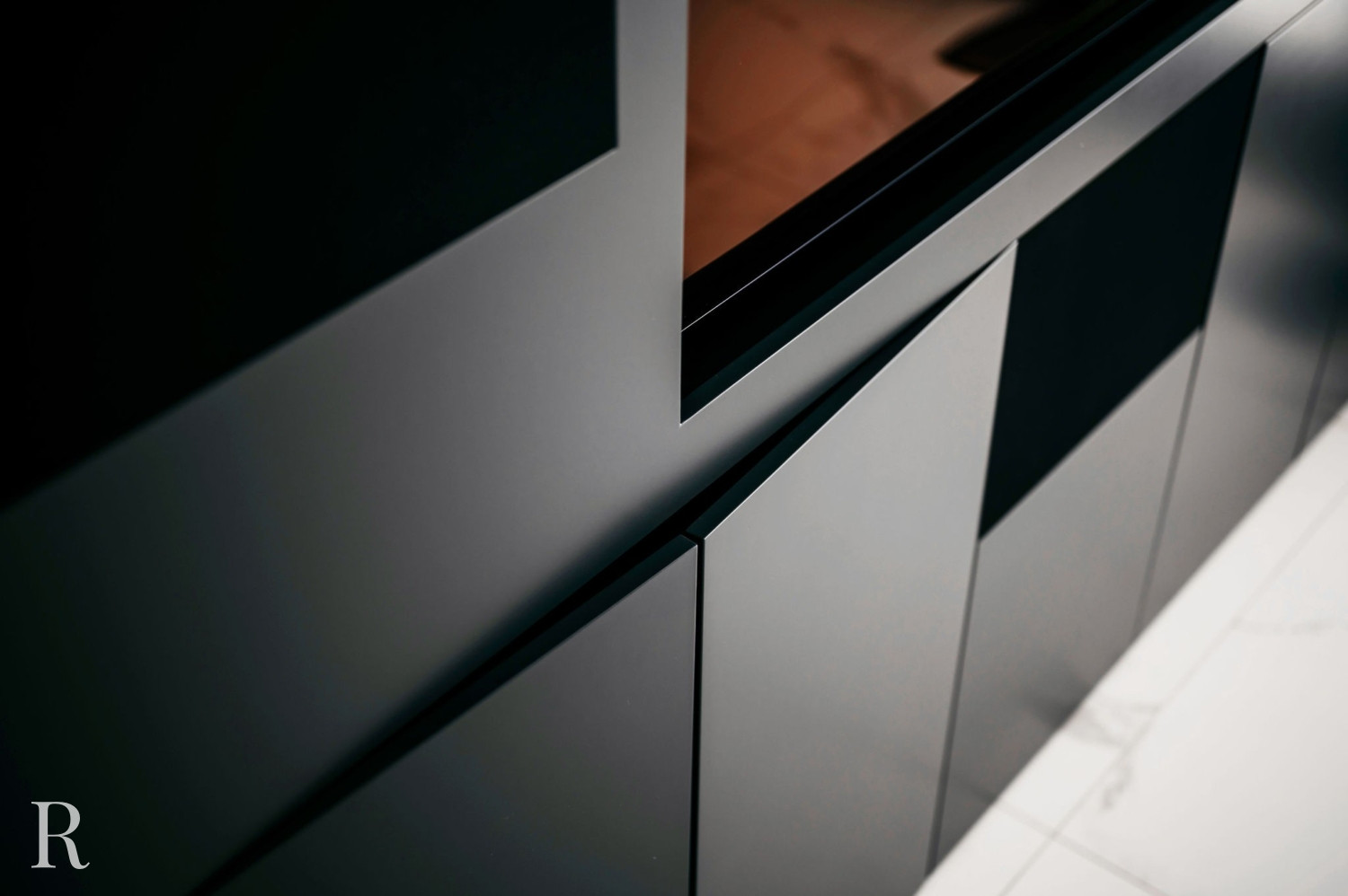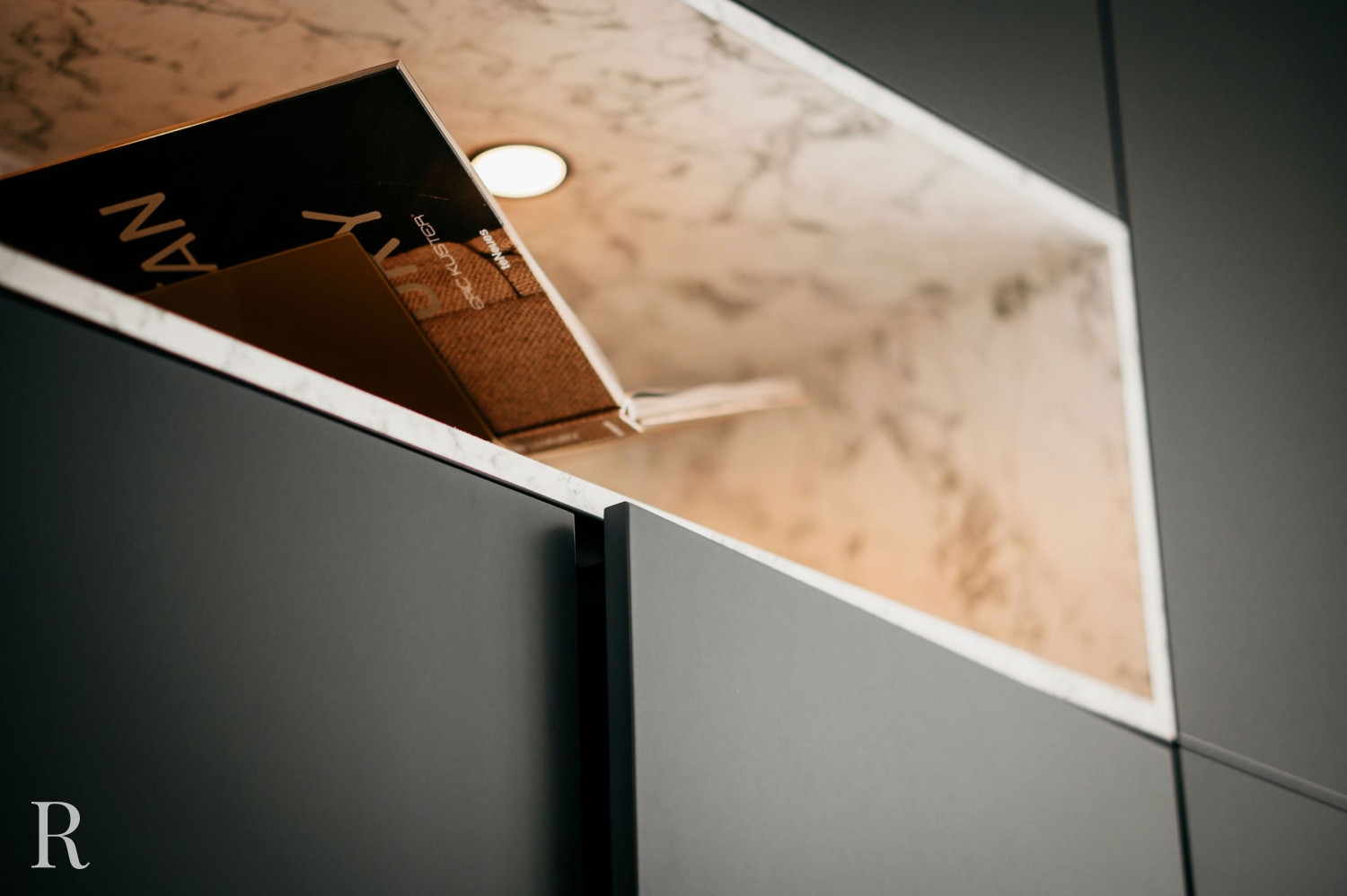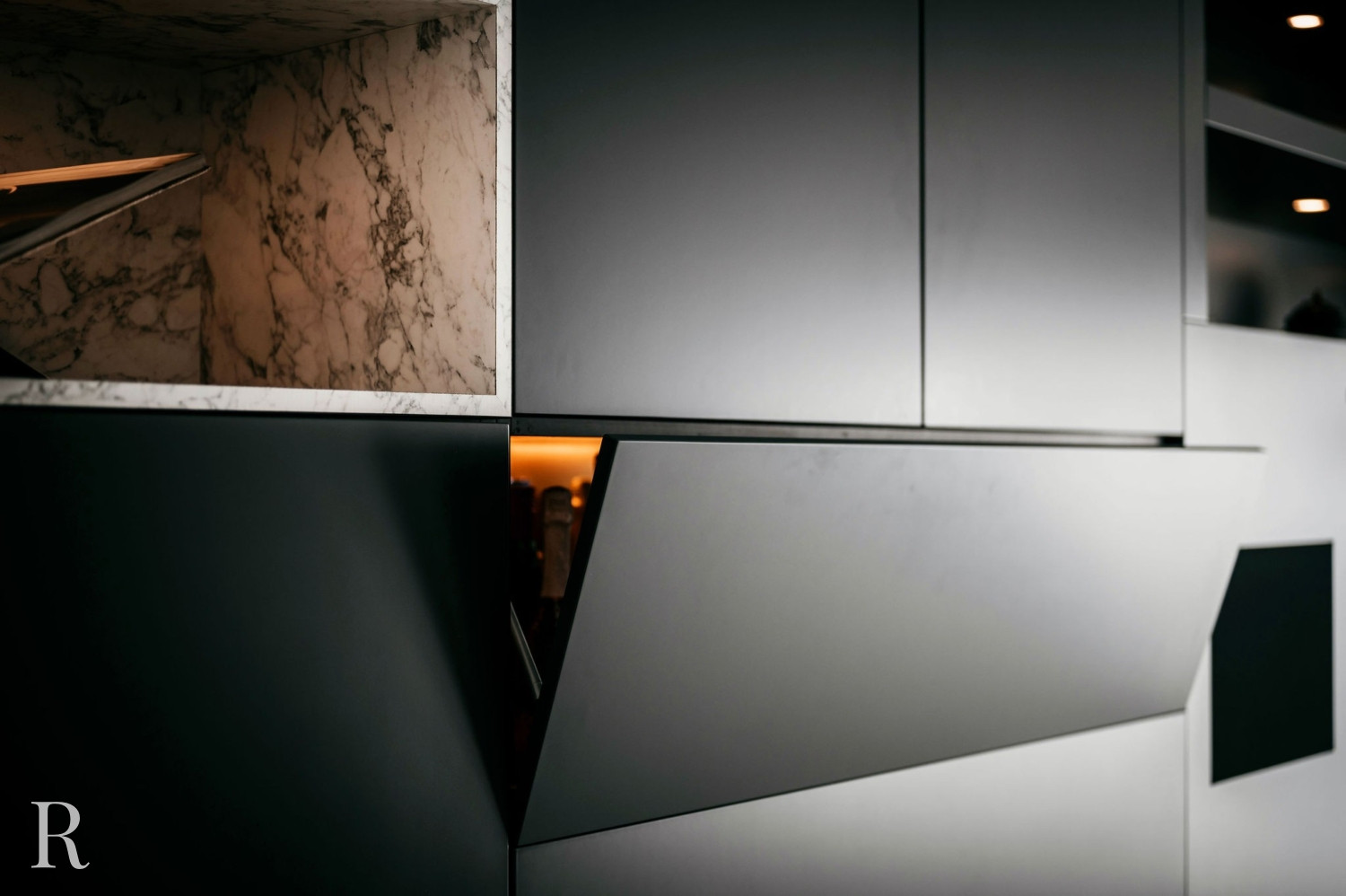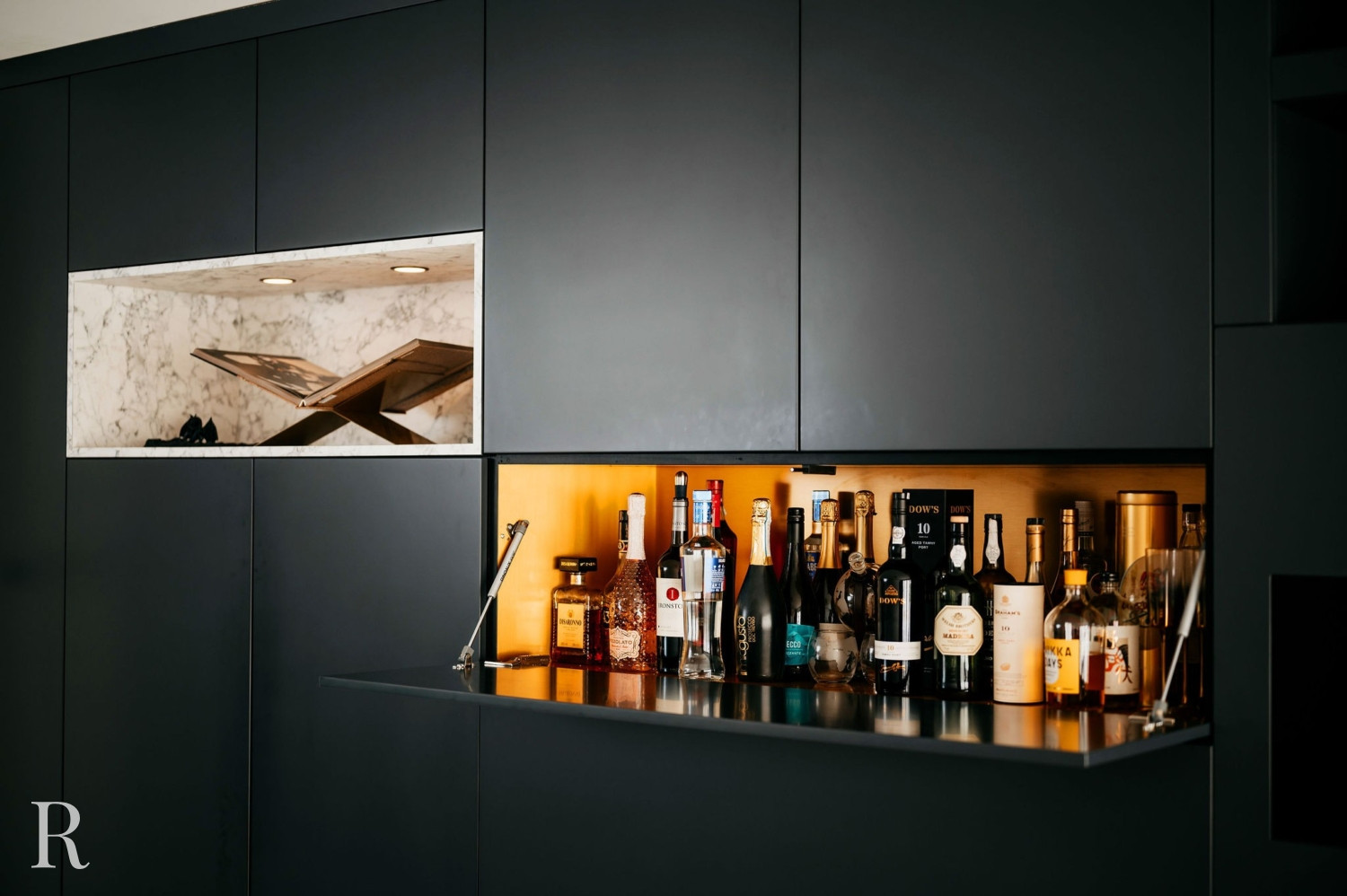 De elektrische sfeerhaard biedt niet alleen warmte, maar functioneert ook als een artistiek element. Het creëert een ambiance van comfort en luxe. Daarboven trekt een inbouwnis de aandacht. Het witte marmer doorbreekt het zwarte oppervlak en verbindt de cinewall met de vloer.