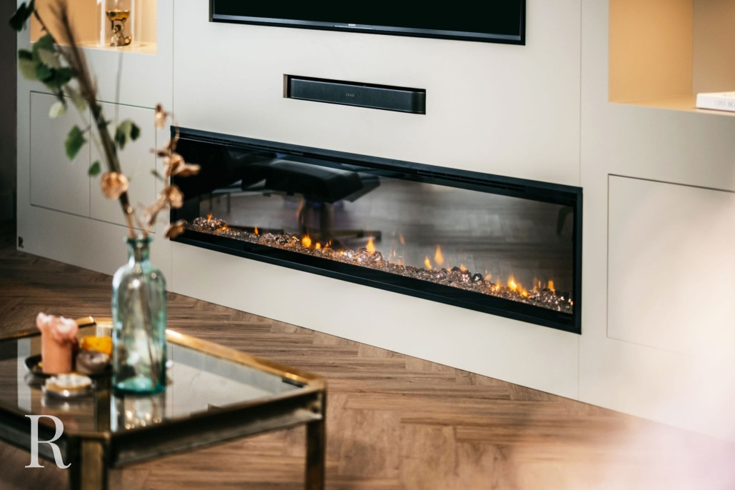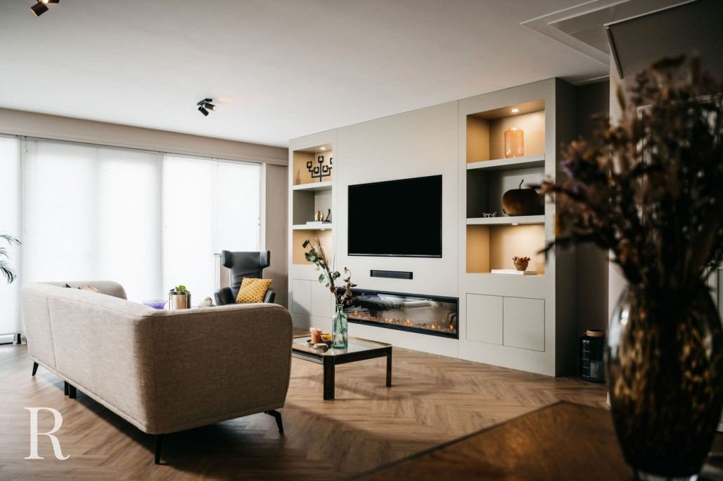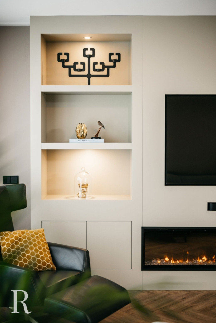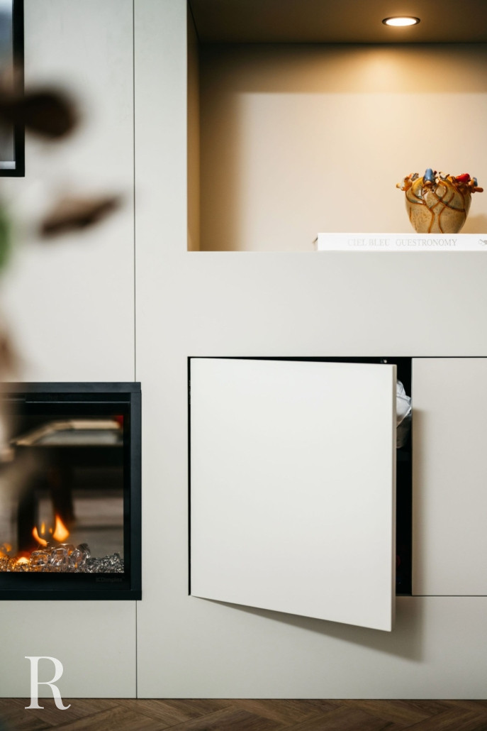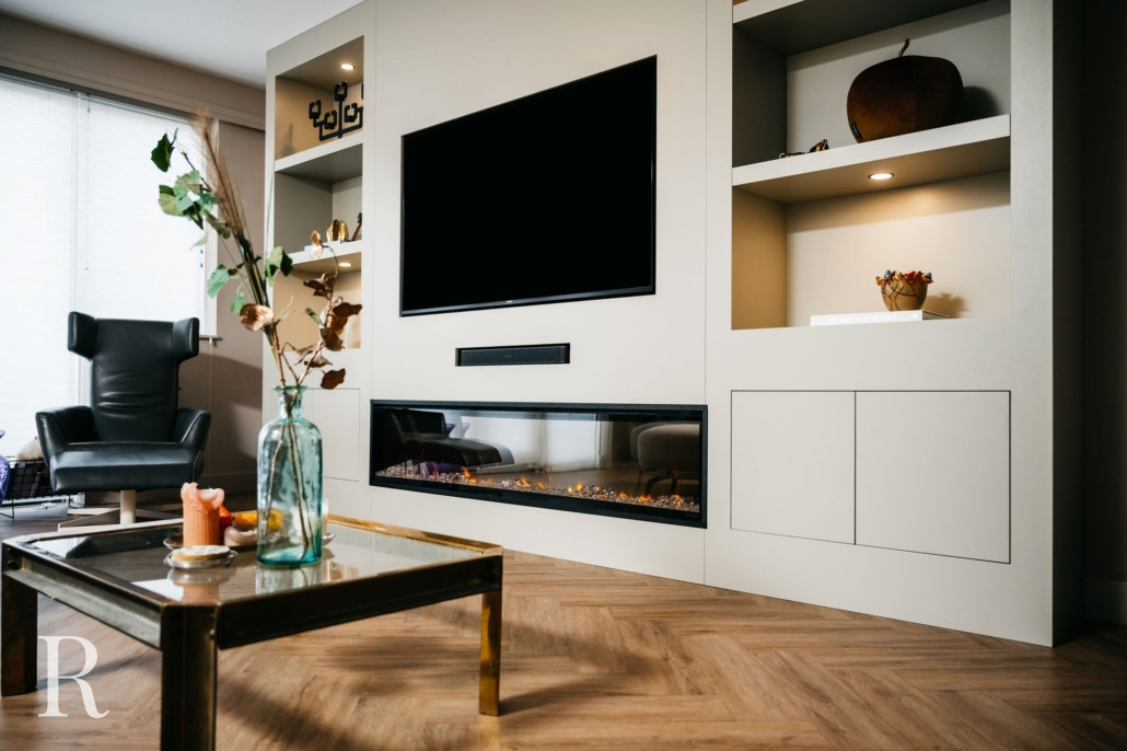 In Vleuten plaatsten we een witte cinewall met zes nissen, twee ladekastjes, een soundbar én een sfeerhaard. Sfeervol, niet?
