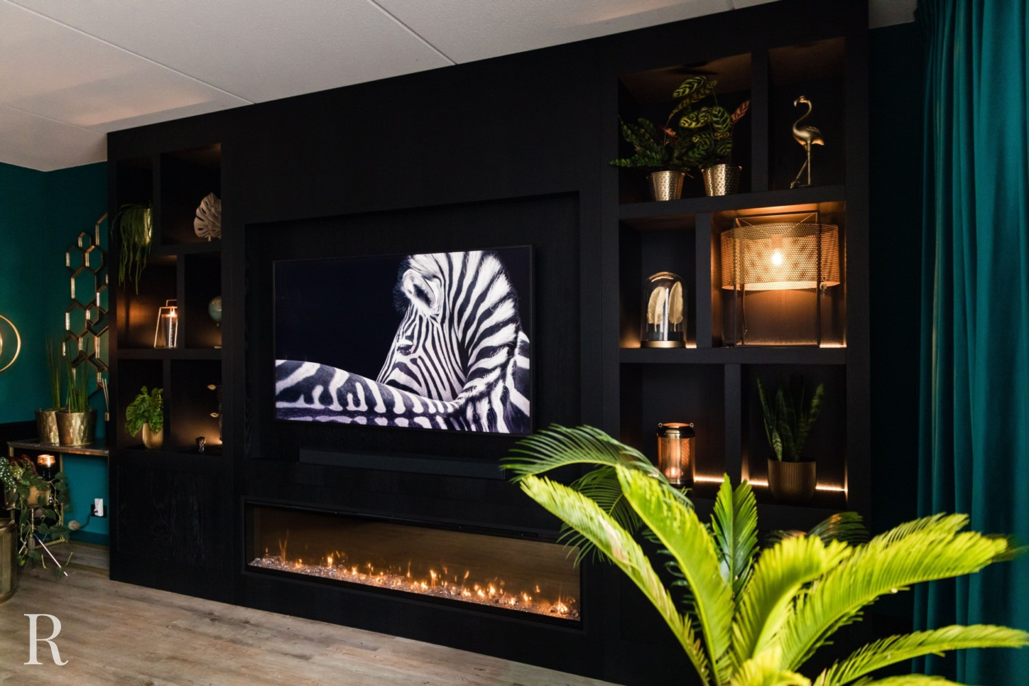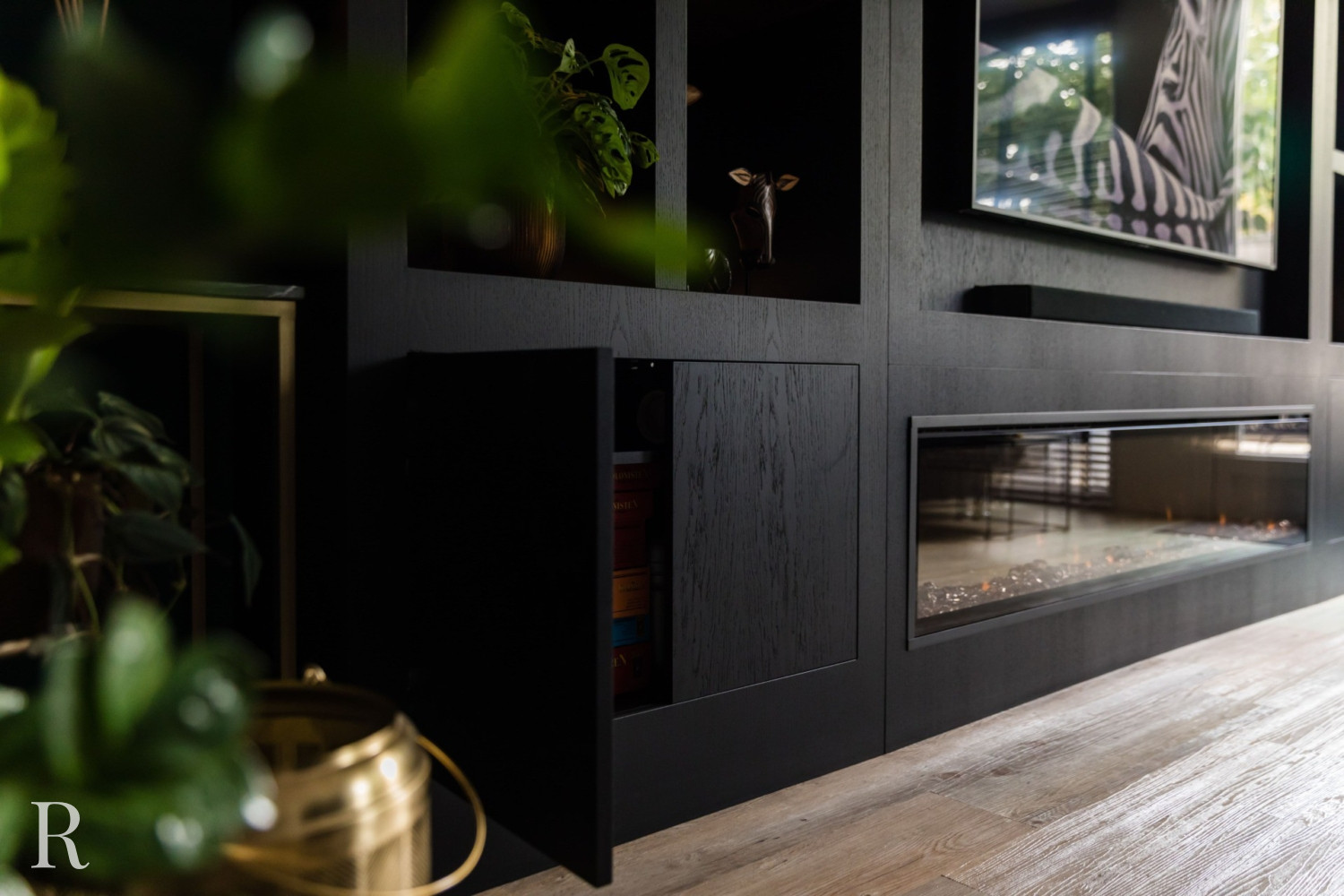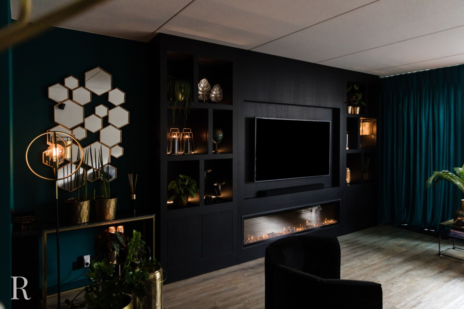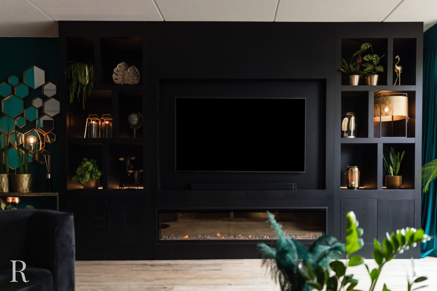 De zwarte plafondhoge tv-wand heeft zowel links als rechts een aantal speelse vakken. Natuurlijk is er ruimte voor een flatscreen tv, soundbar én heuse sfeerhaard. Zo zorgt uw cinewall voor dat heerlijke ‘thuisgevoel’.