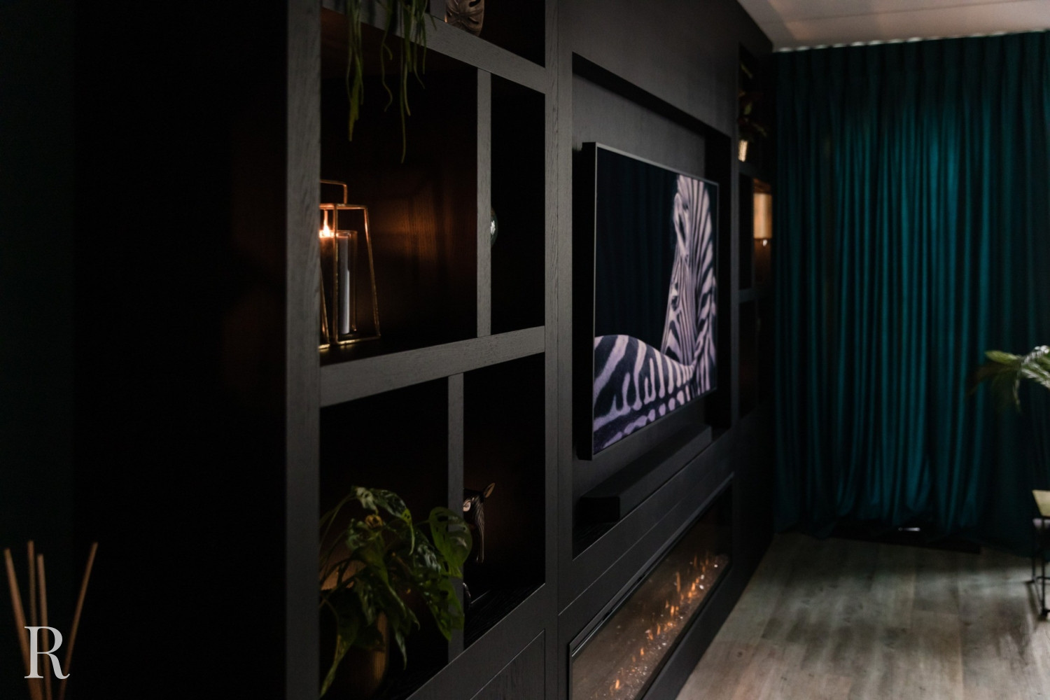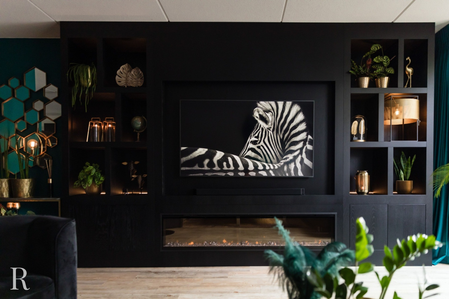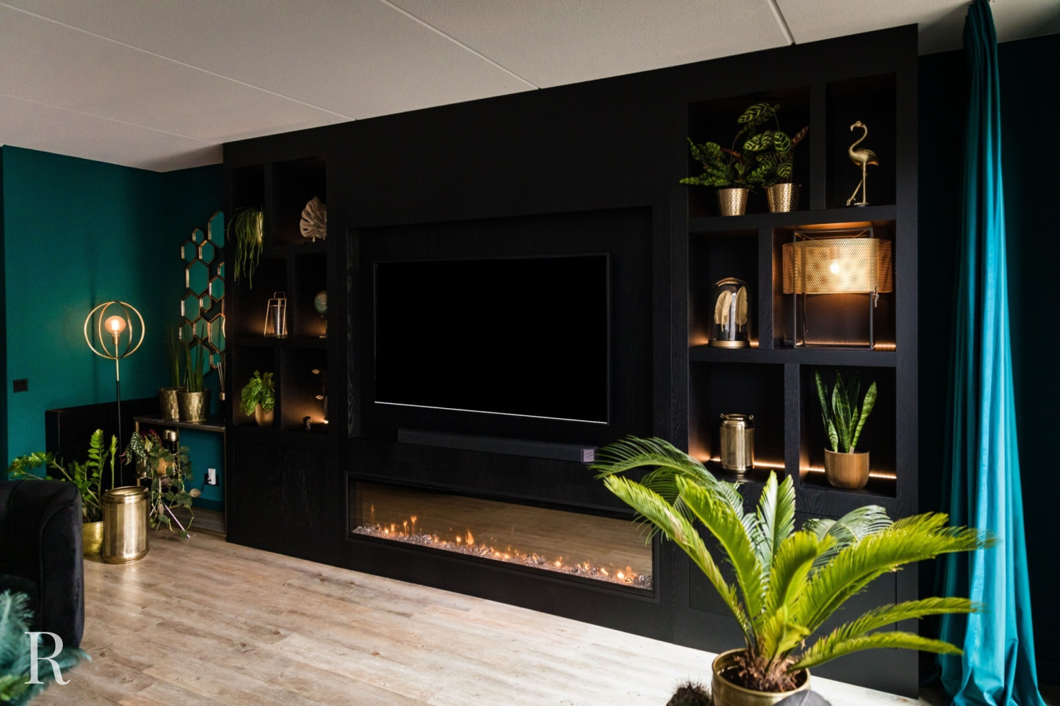 De zwarte plafondhoge tv-wand heeft zowel links als rechts een aantal speelse vakken. Natuurlijk is er ruimte voor een flatscreen tv, soundbar én heuse sfeerhaard. Zo zorgt uw cinewall voor dat heerlijke ‘thuisgevoel’.