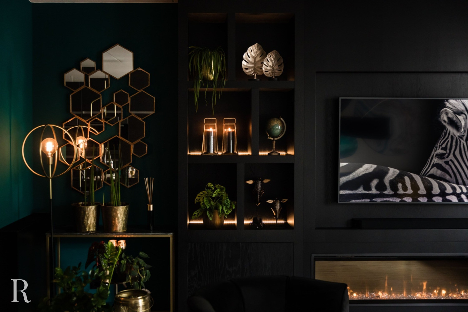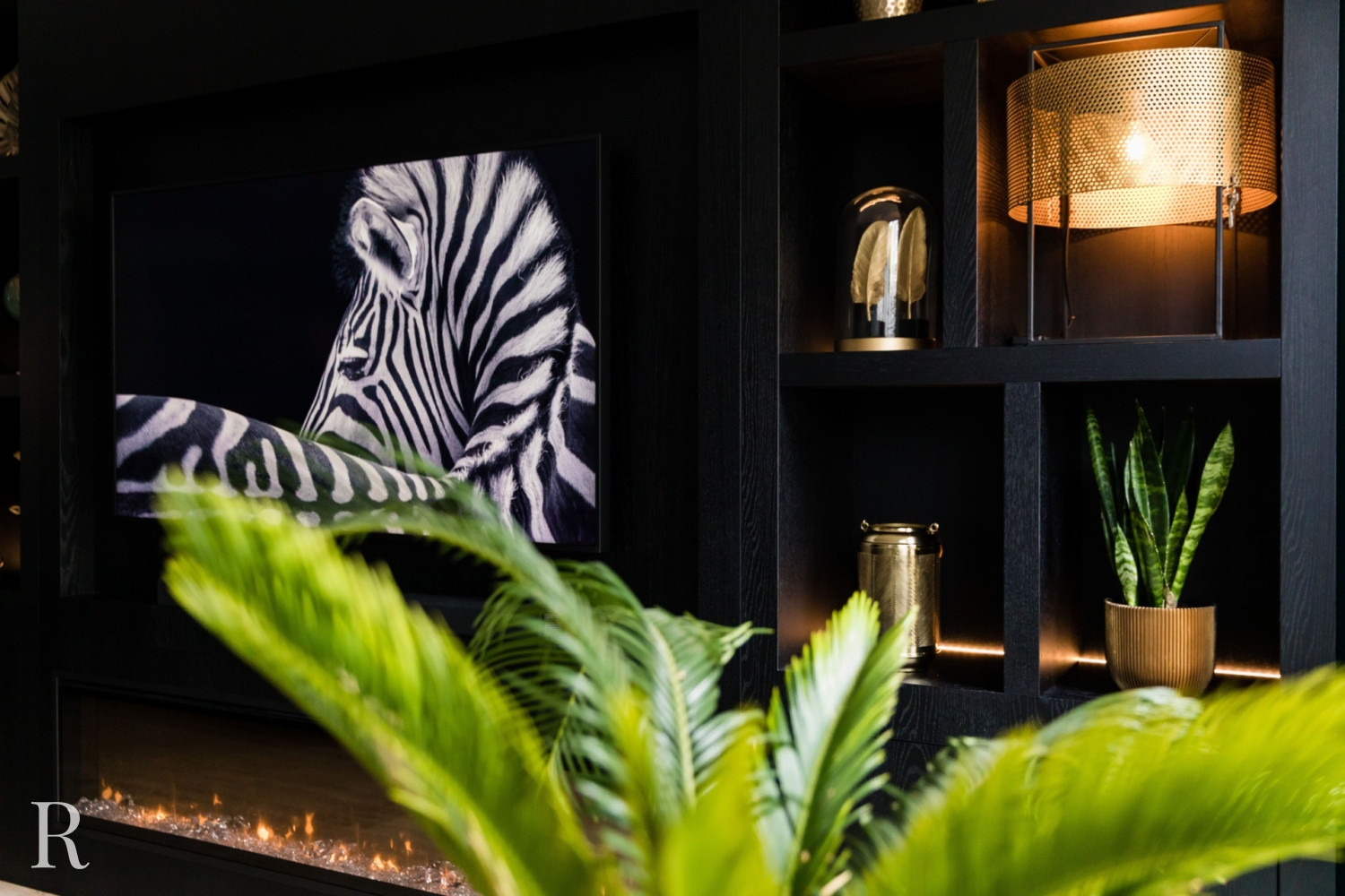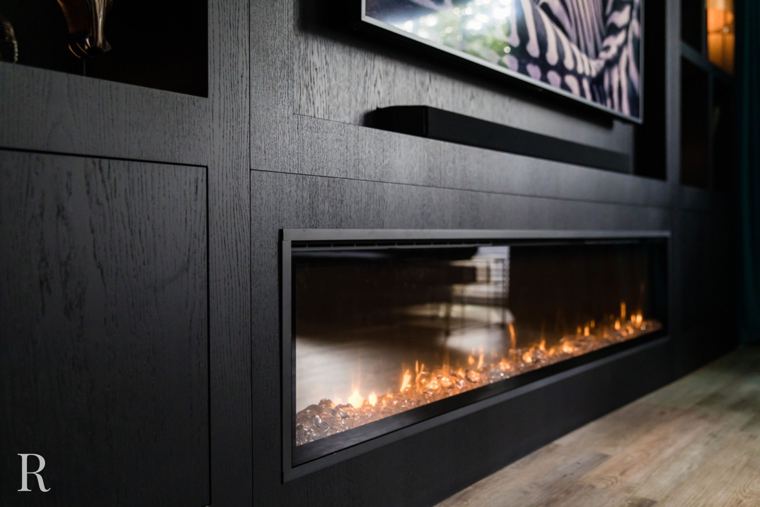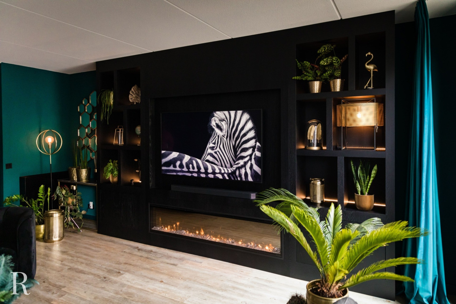 De zwarte plafondhoge tv-wand heeft zowel links als rechts een aantal speelse vakken. Natuurlijk is er ruimte voor een flatscreen tv, soundbar én heuse sfeerhaard. Zo zorgt uw cinewall voor dat heerlijke ‘thuisgevoel’.