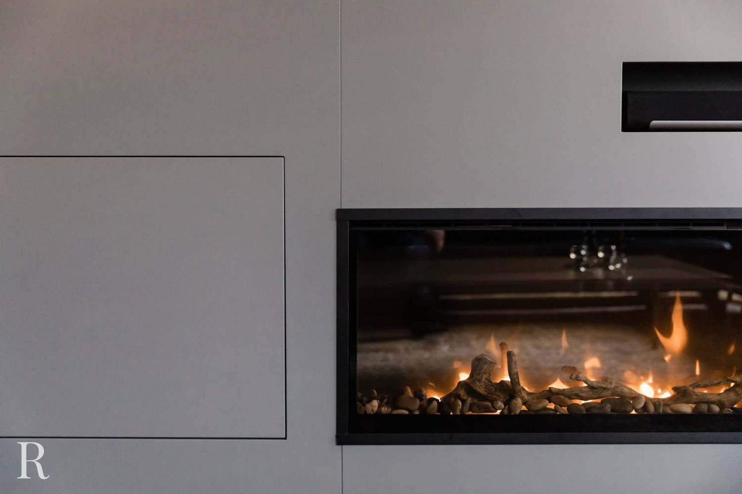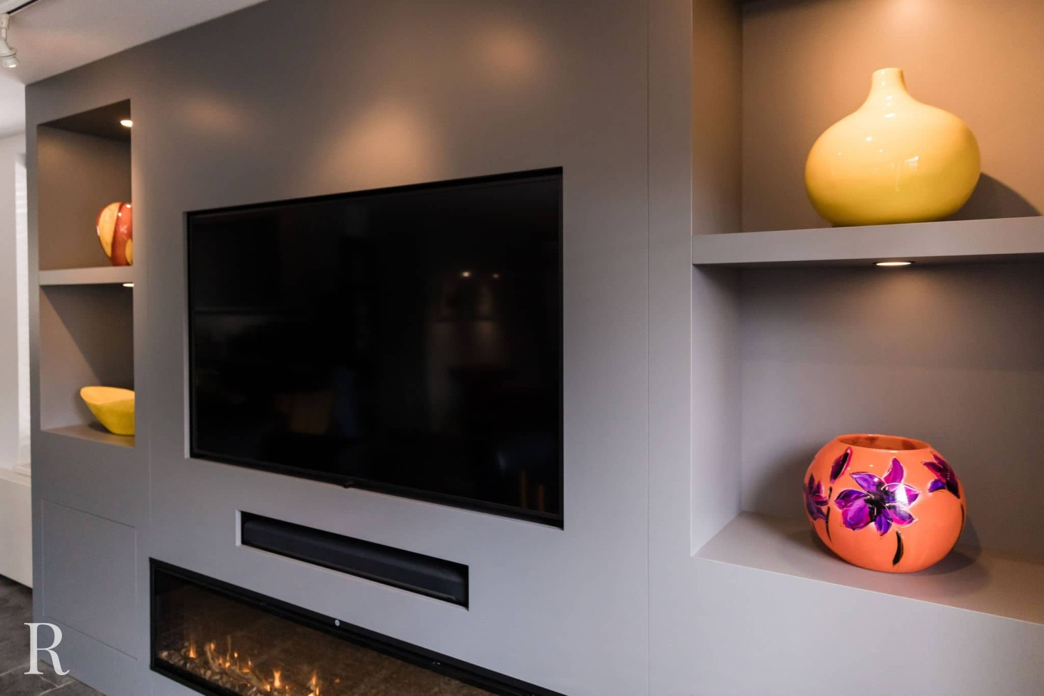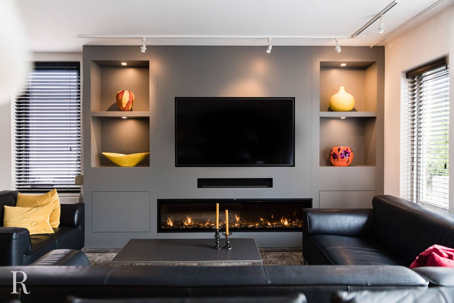 In Zwartsluis bouwden we een plafondhoge tv-wand met flatscreen tv, soundbar en sfeerhaard. Een karakteristiek meubel in een prachtige antracietkleur!