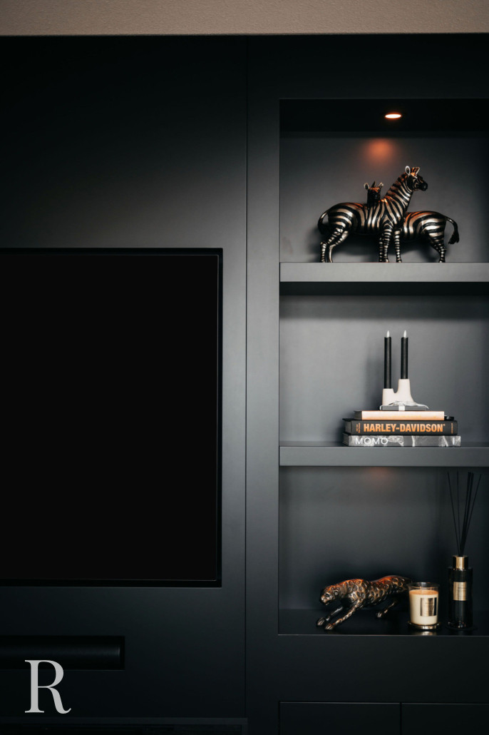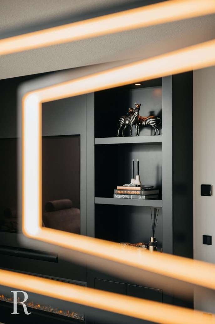 De symmetrische indeling is daar een belangrijk onderdeel van. Aan weerszijden van de flatscreen tv plaatsten we open en gesloten kasten. Dat is niet alleen een praktische oplossing, maar ook een manier om uw persoonlijke stijl te laten zien. De ingebouwde verlichting geeft de tv-wand een extra dimensie.